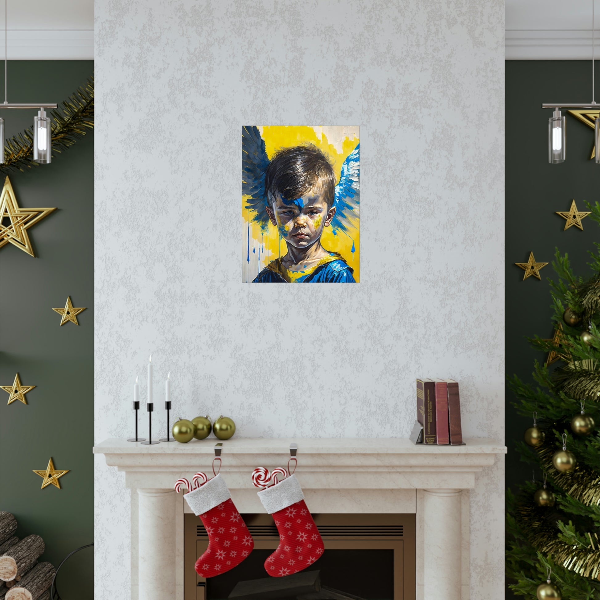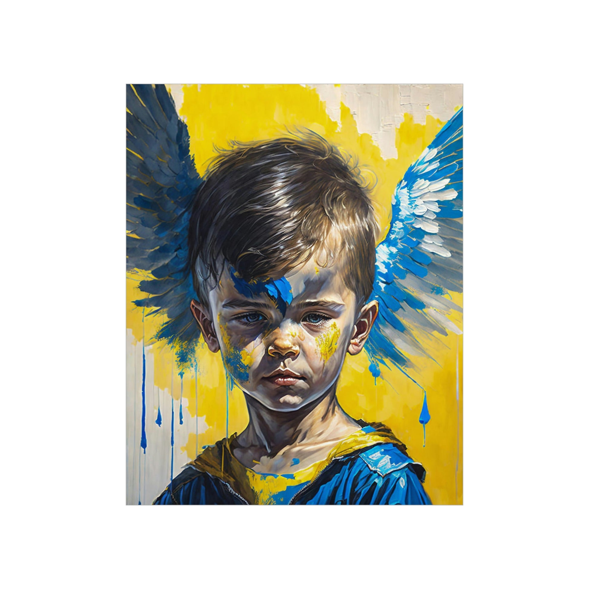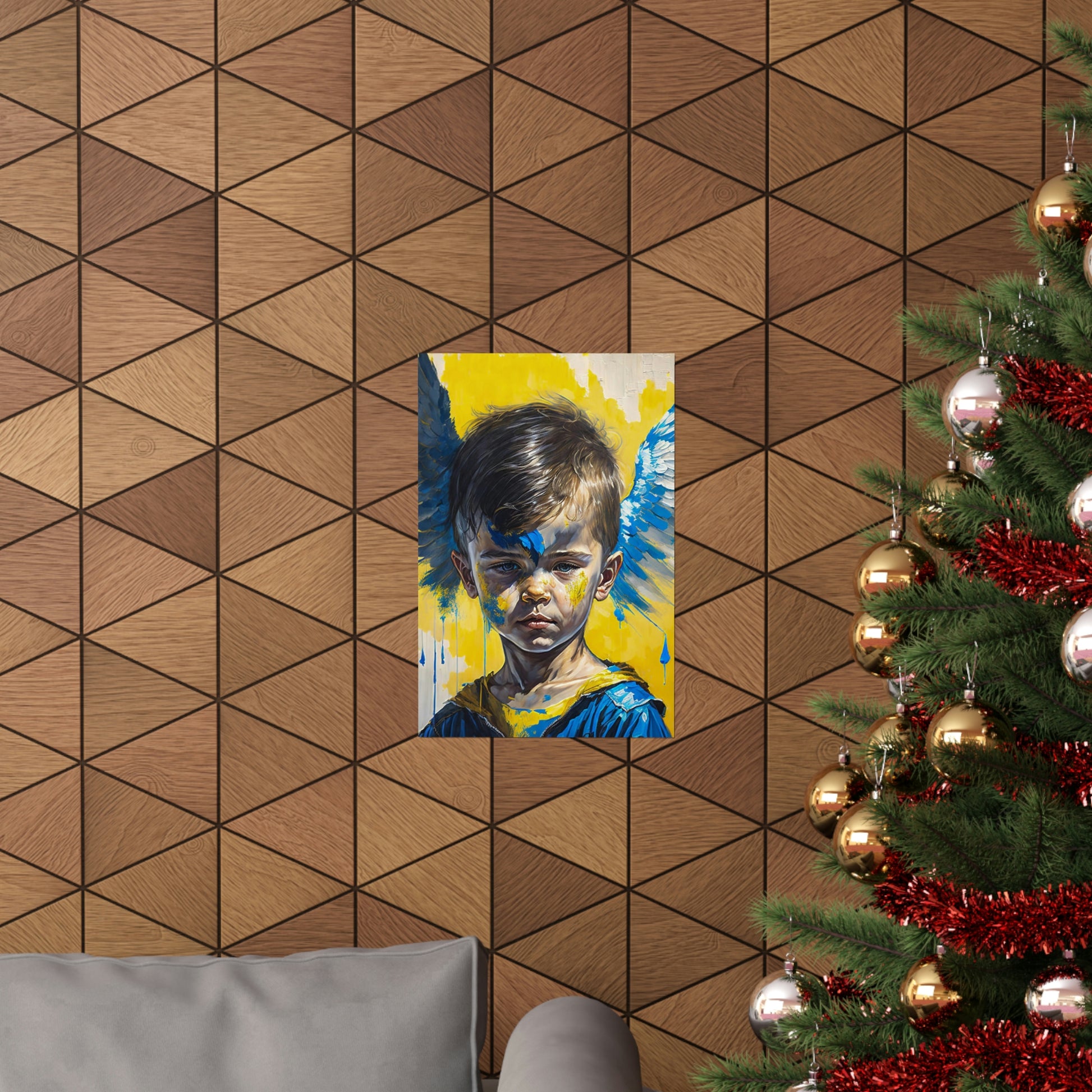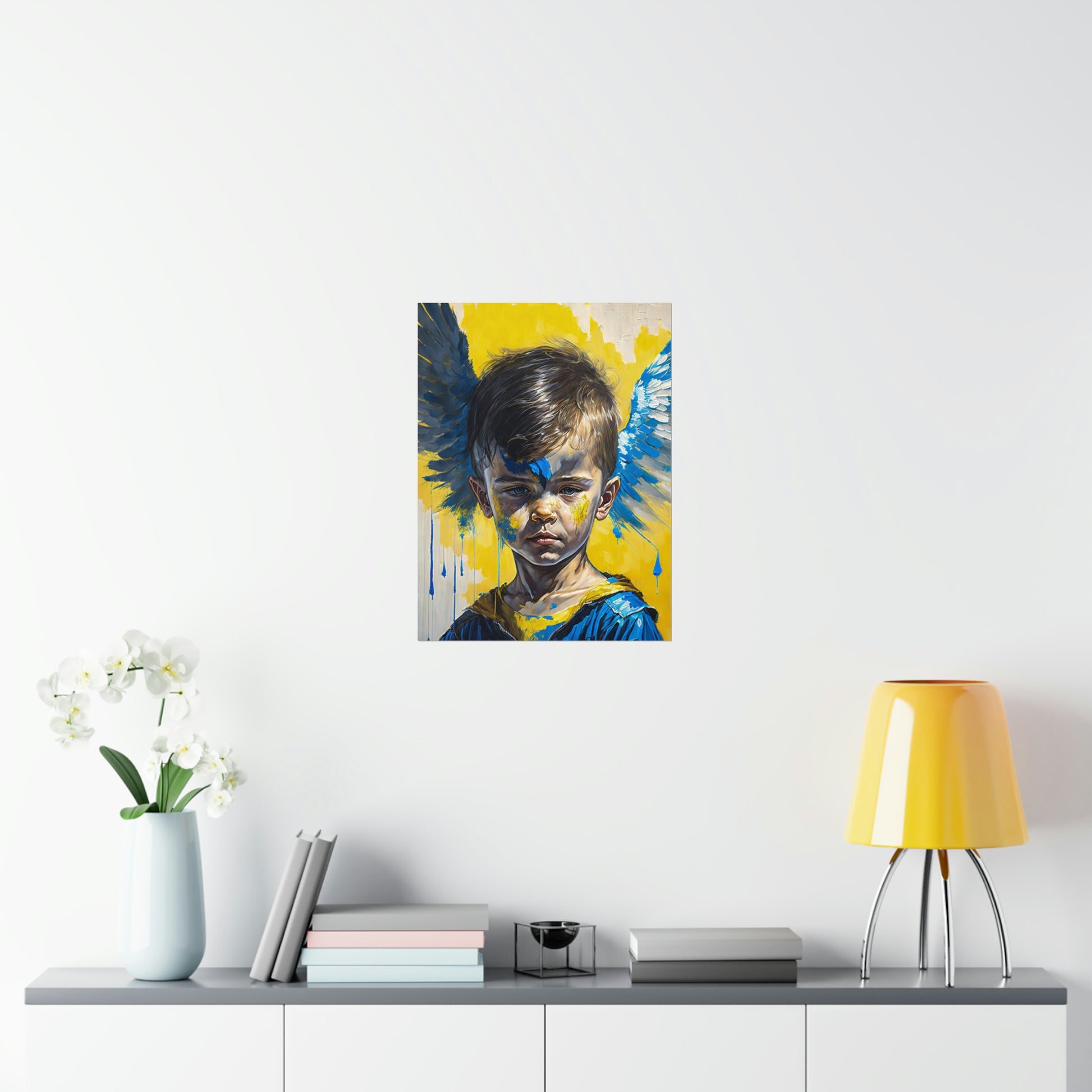 Premium matte vertical poster print out of an acryl painting of an Ukrainian victim of war child with angel wings.