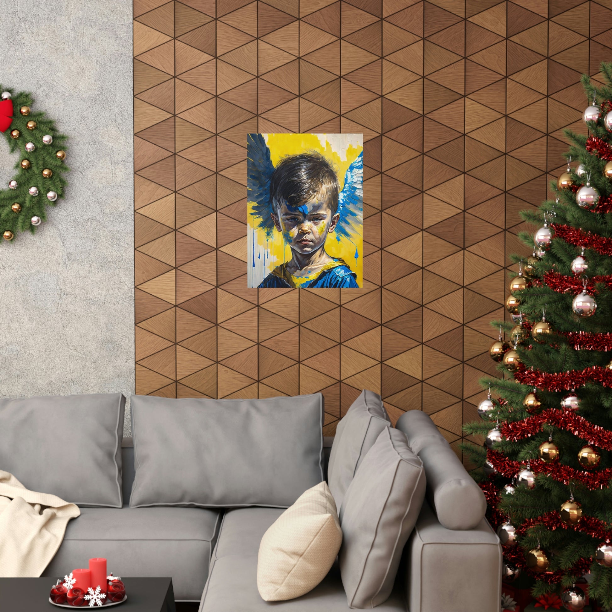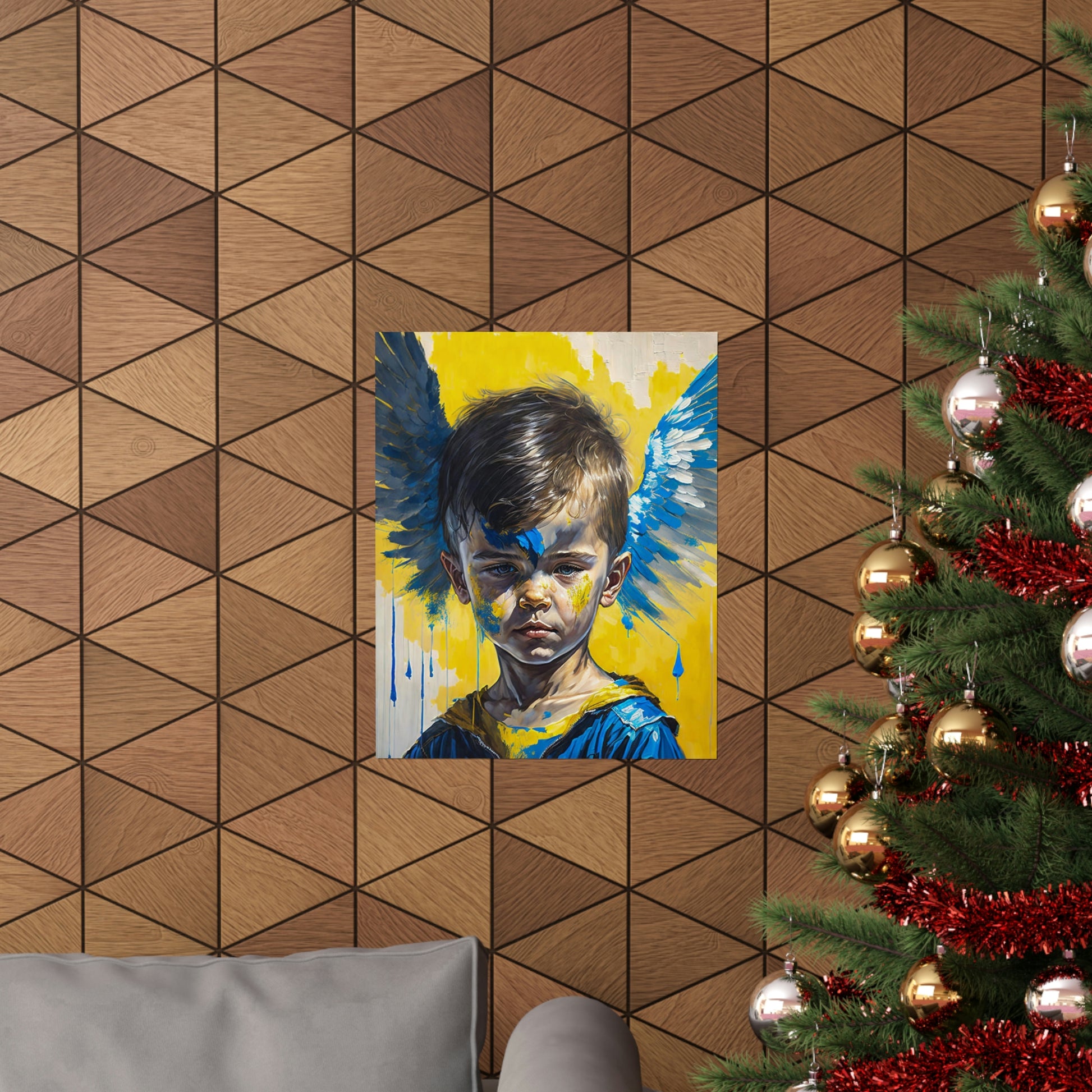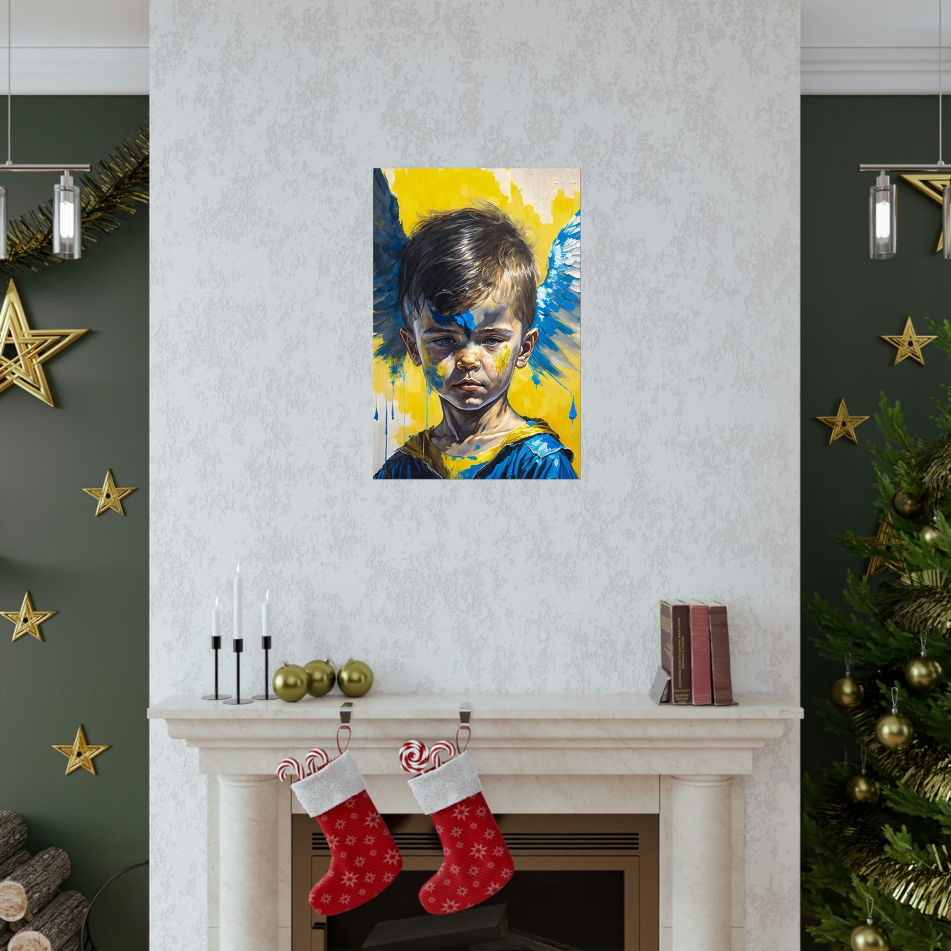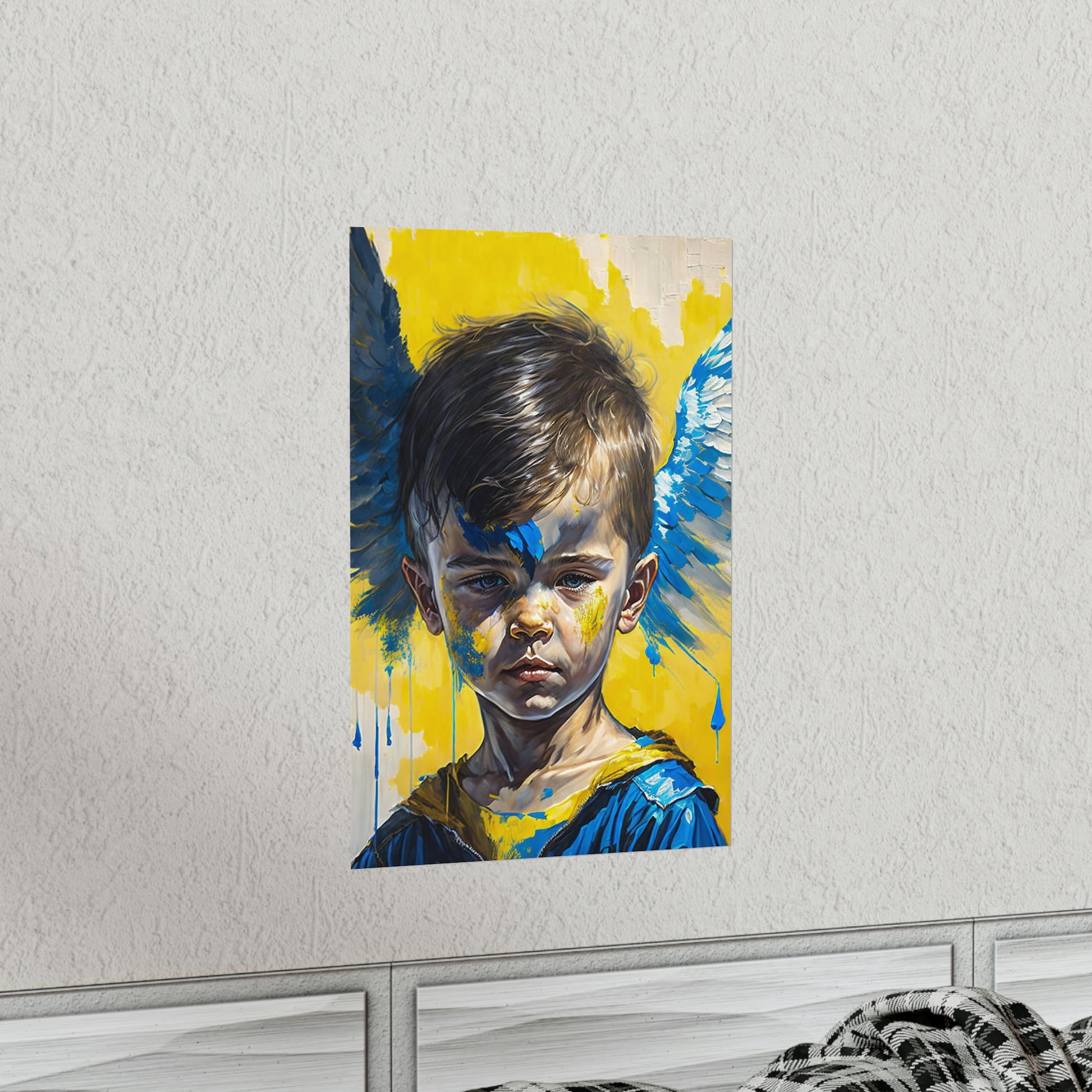 Premium matte vertical poster print out of an acryl painting of an Ukrainian victim of war child with angel wings.