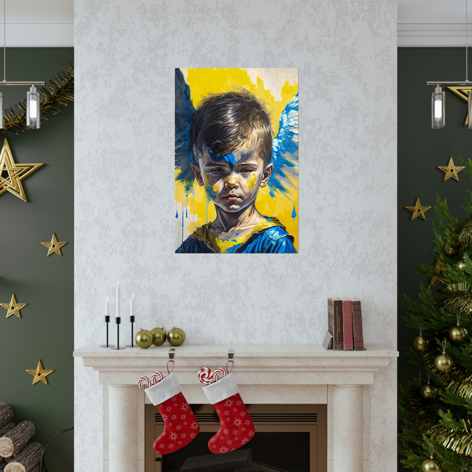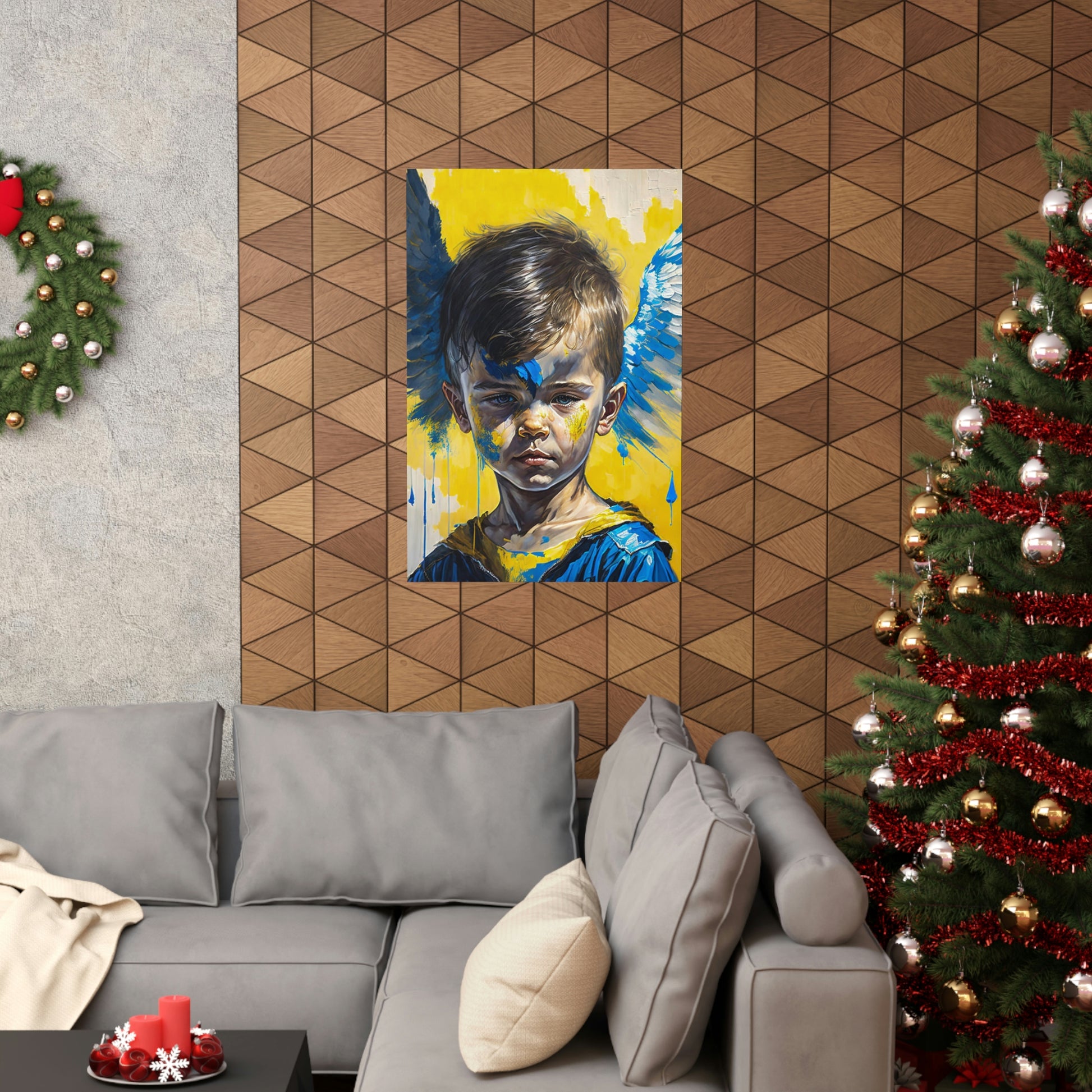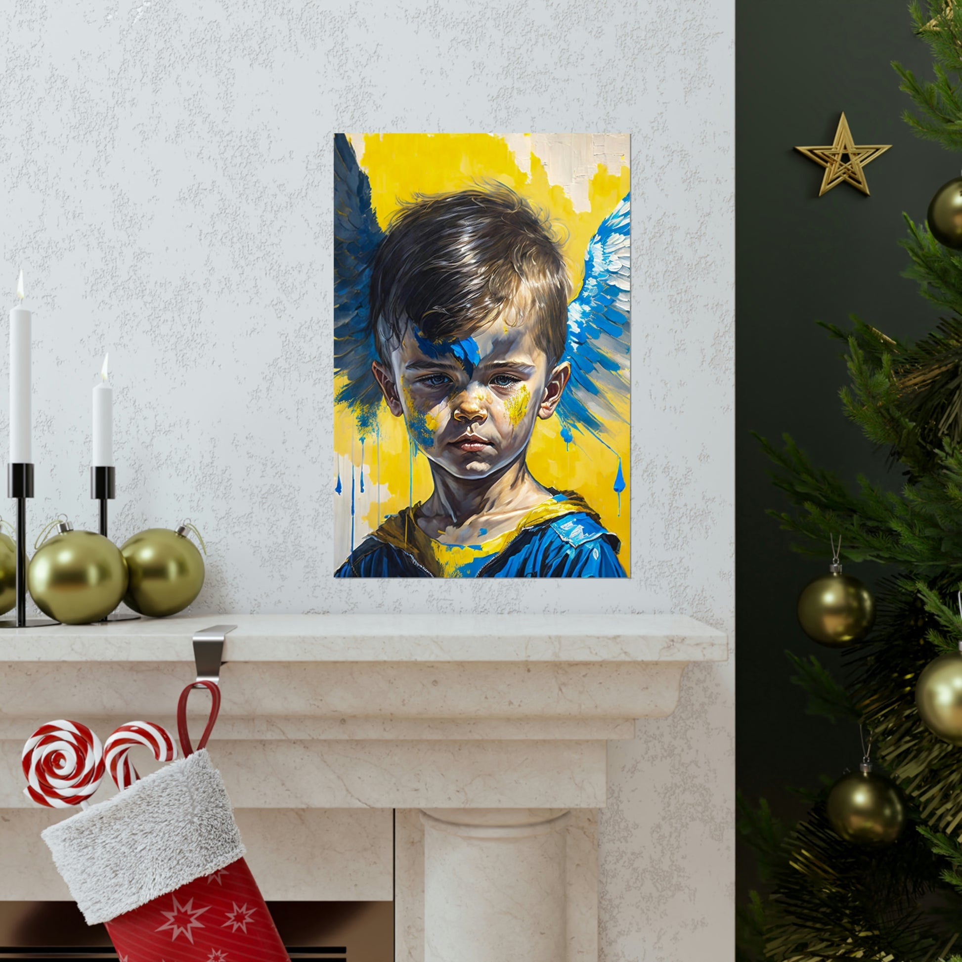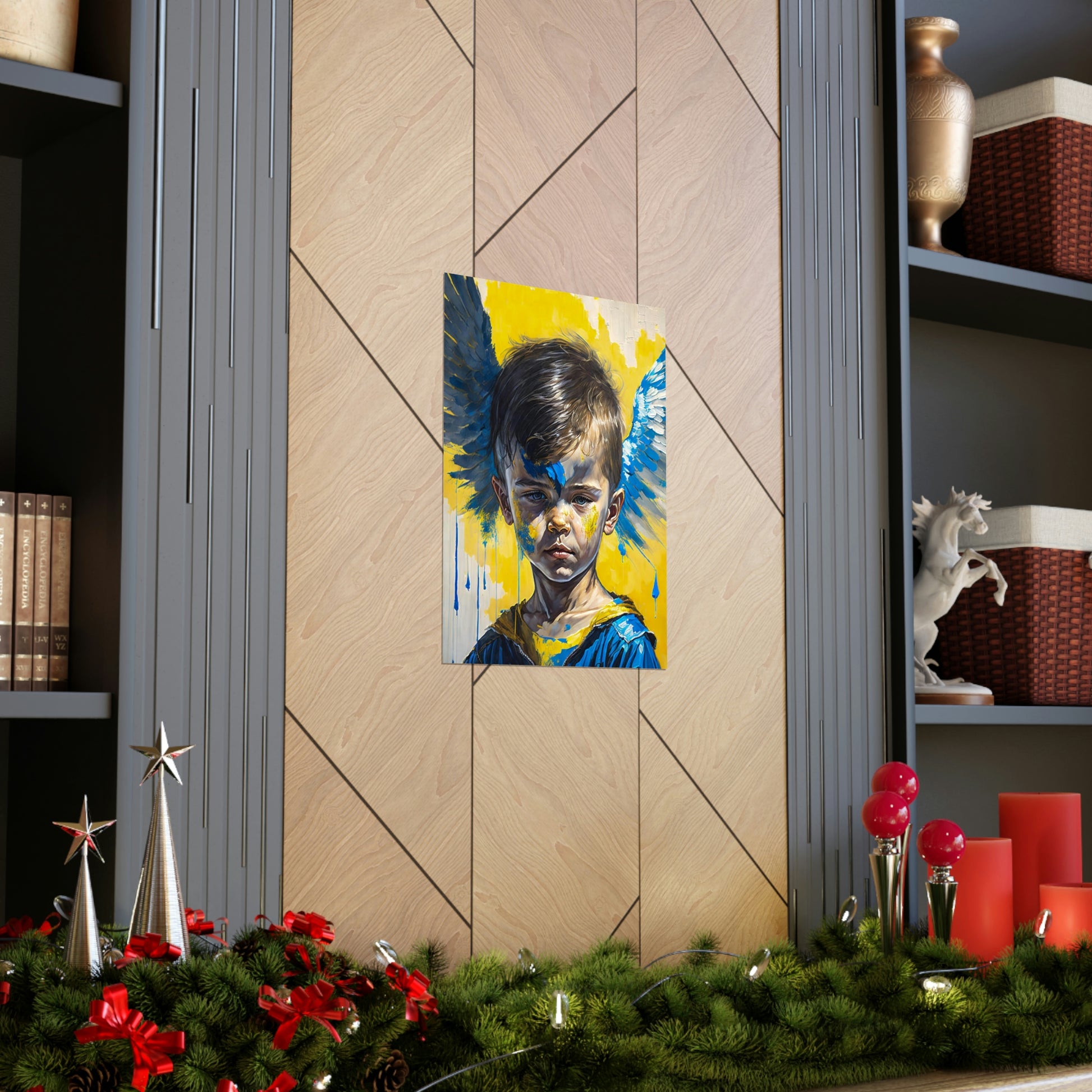 Premium matte vertical poster print out of an acryl painting of an Ukrainian victim of war child with angel wings.