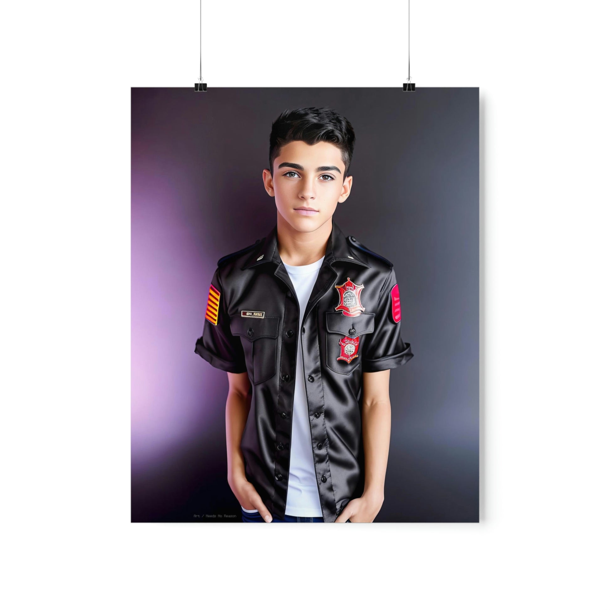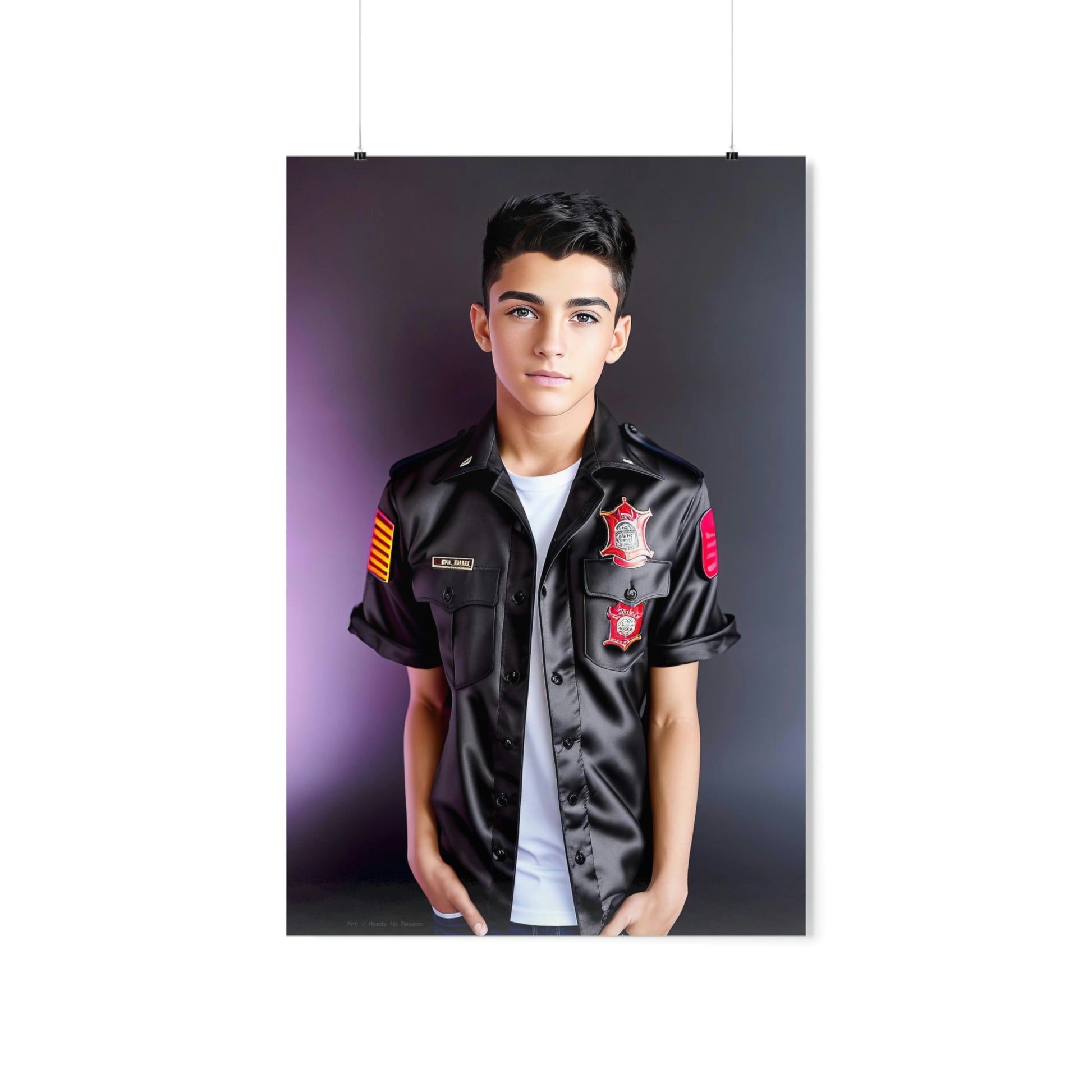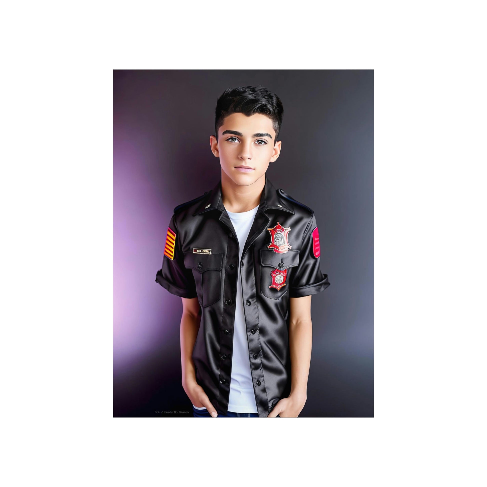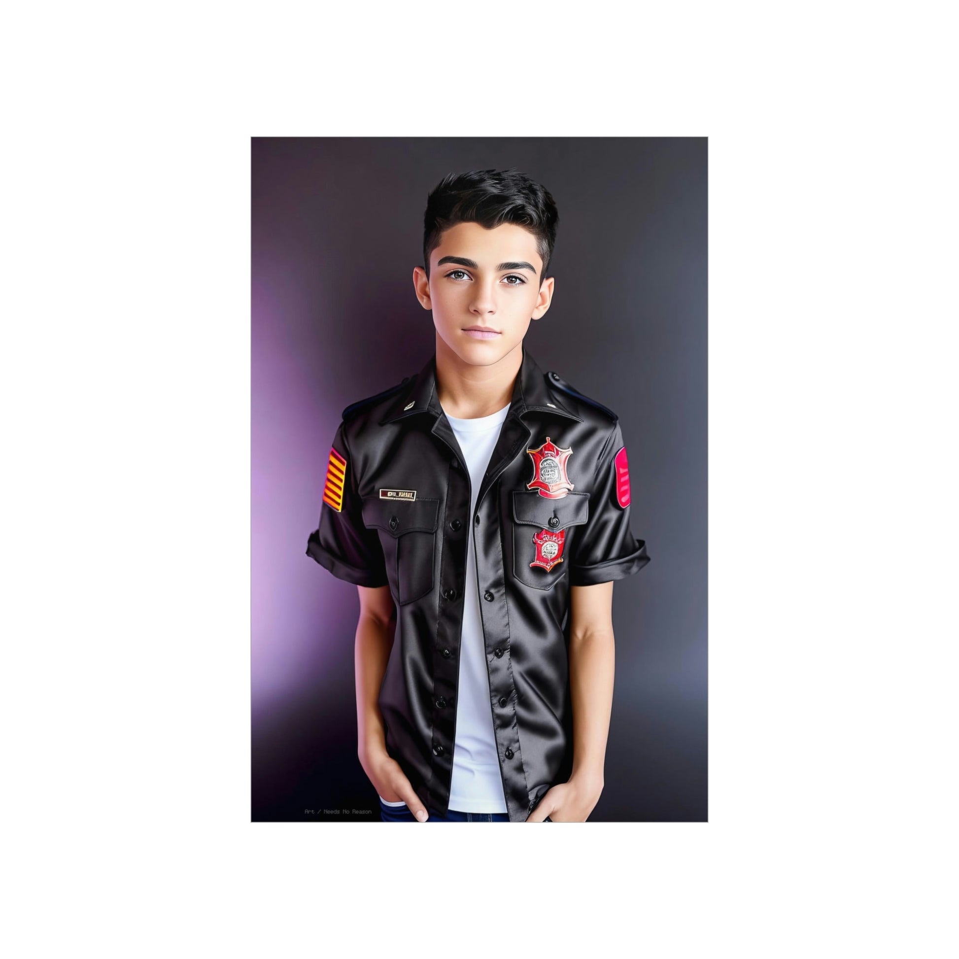 Premium matte inspirational vertical poster shows the boy proudly wearing a jacket with large shiny emblem of a firefighter’s squadron on the chest. The boy has a determined and committed expression on his face, which suggests that he has a clear idea of what he wants to become. Despite being skinny and young, he has the determination to become strong enough and will surely be ready when the time comes. He has his arms calmly placed in the pockets of his jeans, giving the impression of a relaxed and collected individual. The background is solid black with some violet light on the left side and some soft white light on the right, which creates a dramatic and contrasting effect.