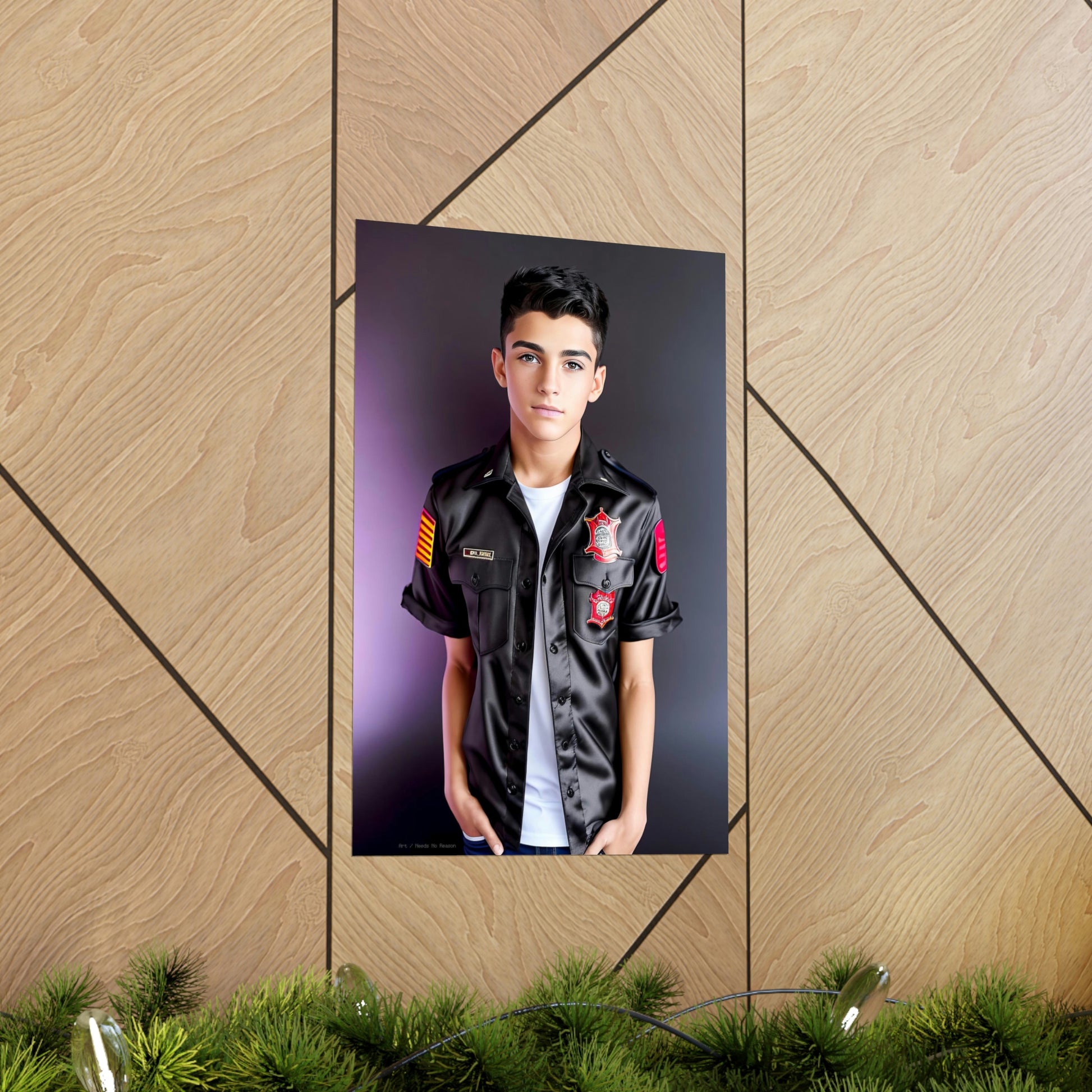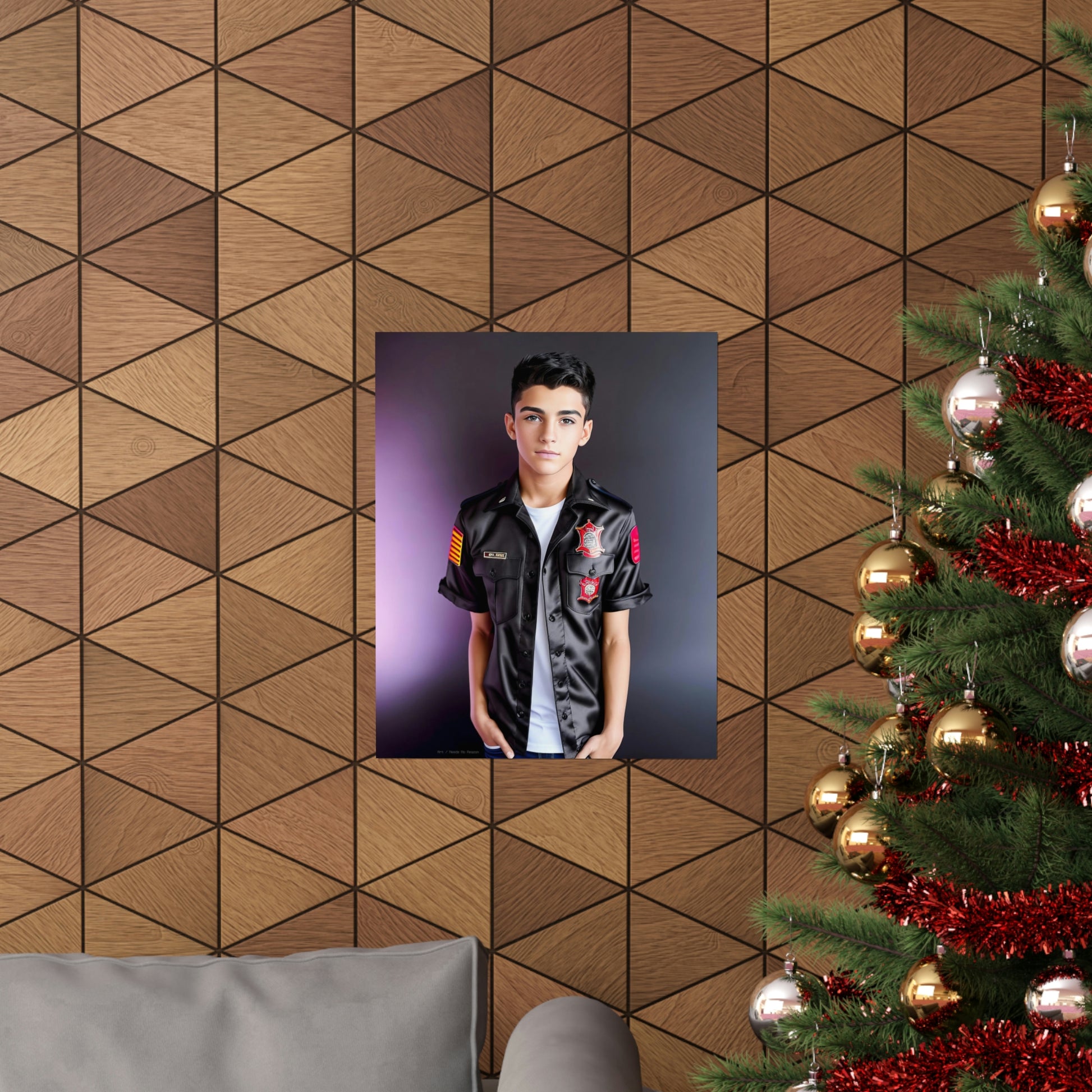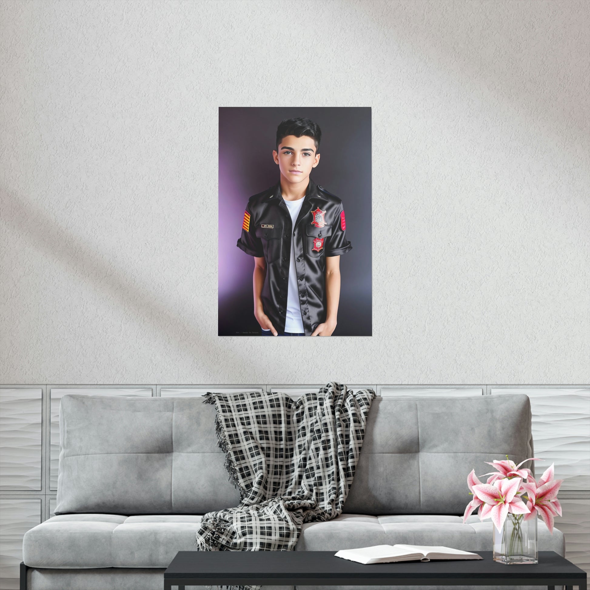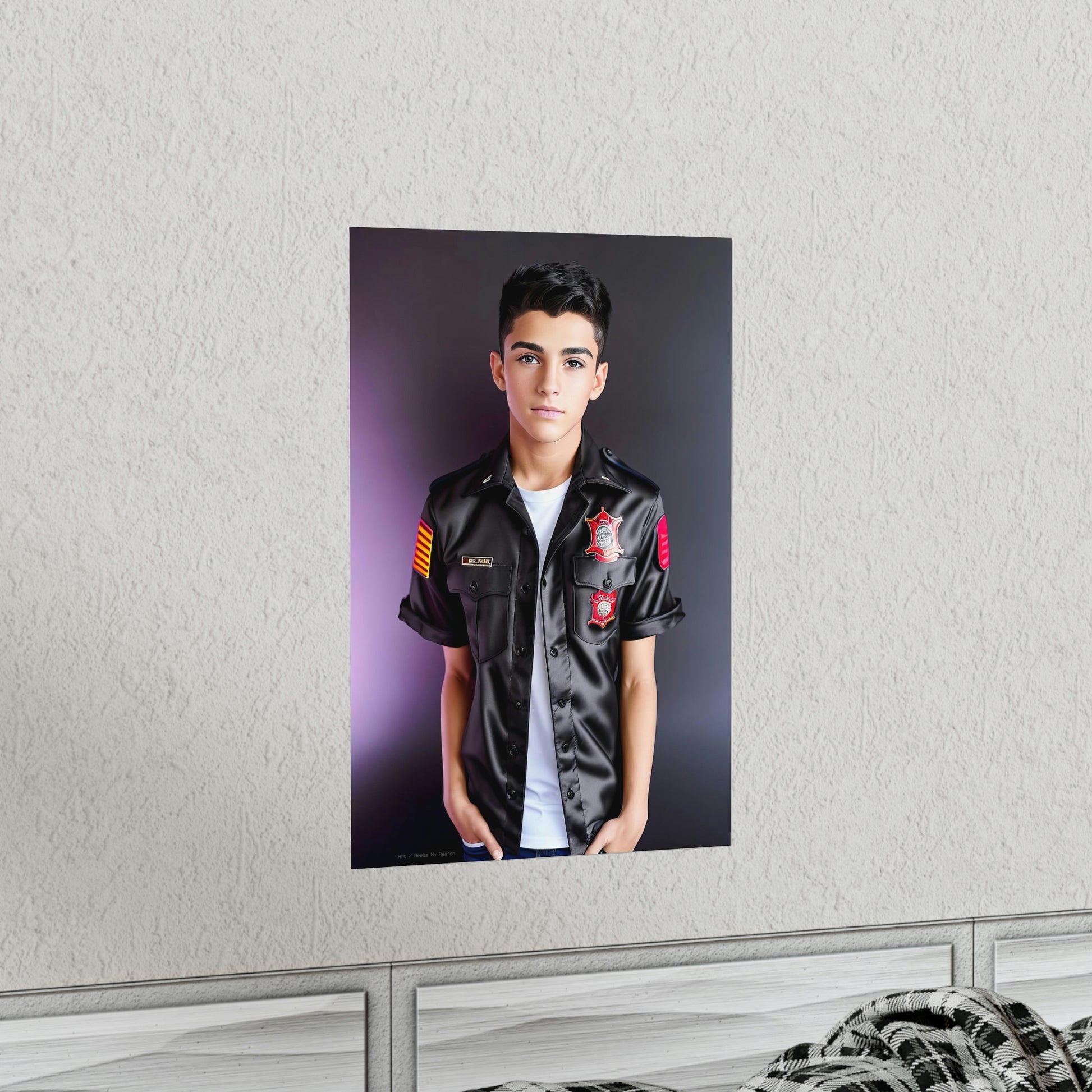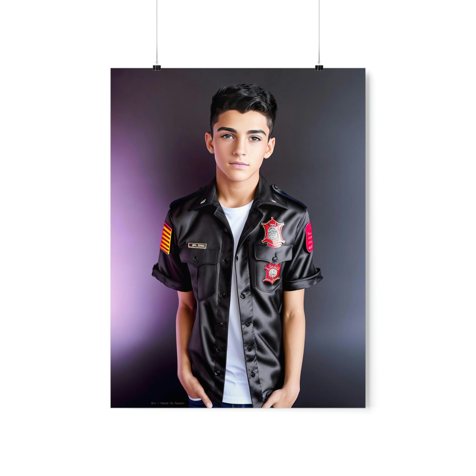 Premium matte inspirational vertical poster shows the boy proudly wearing a jacket with large shiny emblem of a firefighter’s squadron on the chest. The boy has a determined and committed expression on his face, which suggests that he has a clear idea of what he wants to become. Despite being skinny and young, he has the determination to become strong enough and will surely be ready when the time comes. He has his arms calmly placed in the pockets of his jeans, giving the impression of a relaxed and collected individual. The background is solid black with some violet light on the left side and some soft white light on the right, which creates a dramatic and contrasting effect.