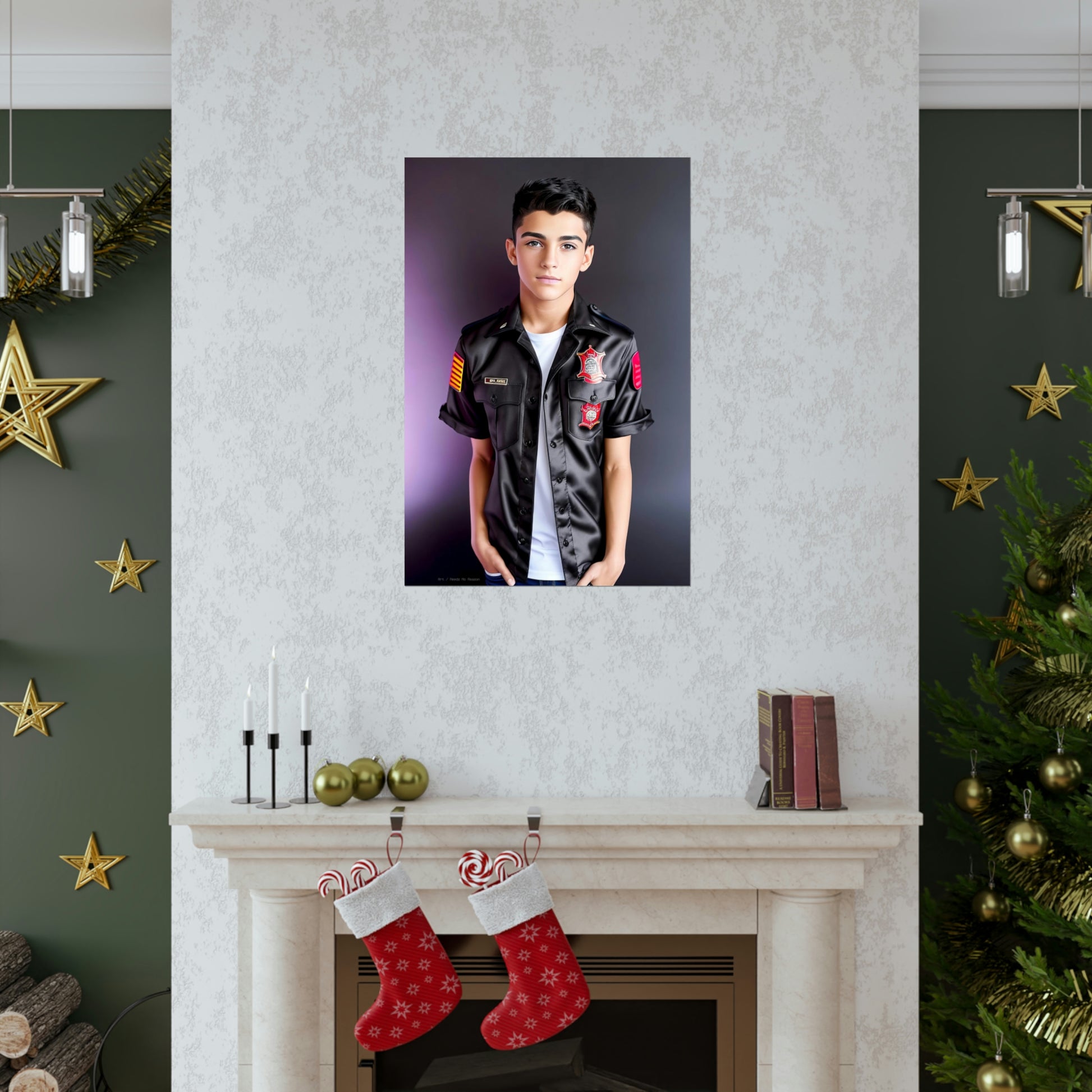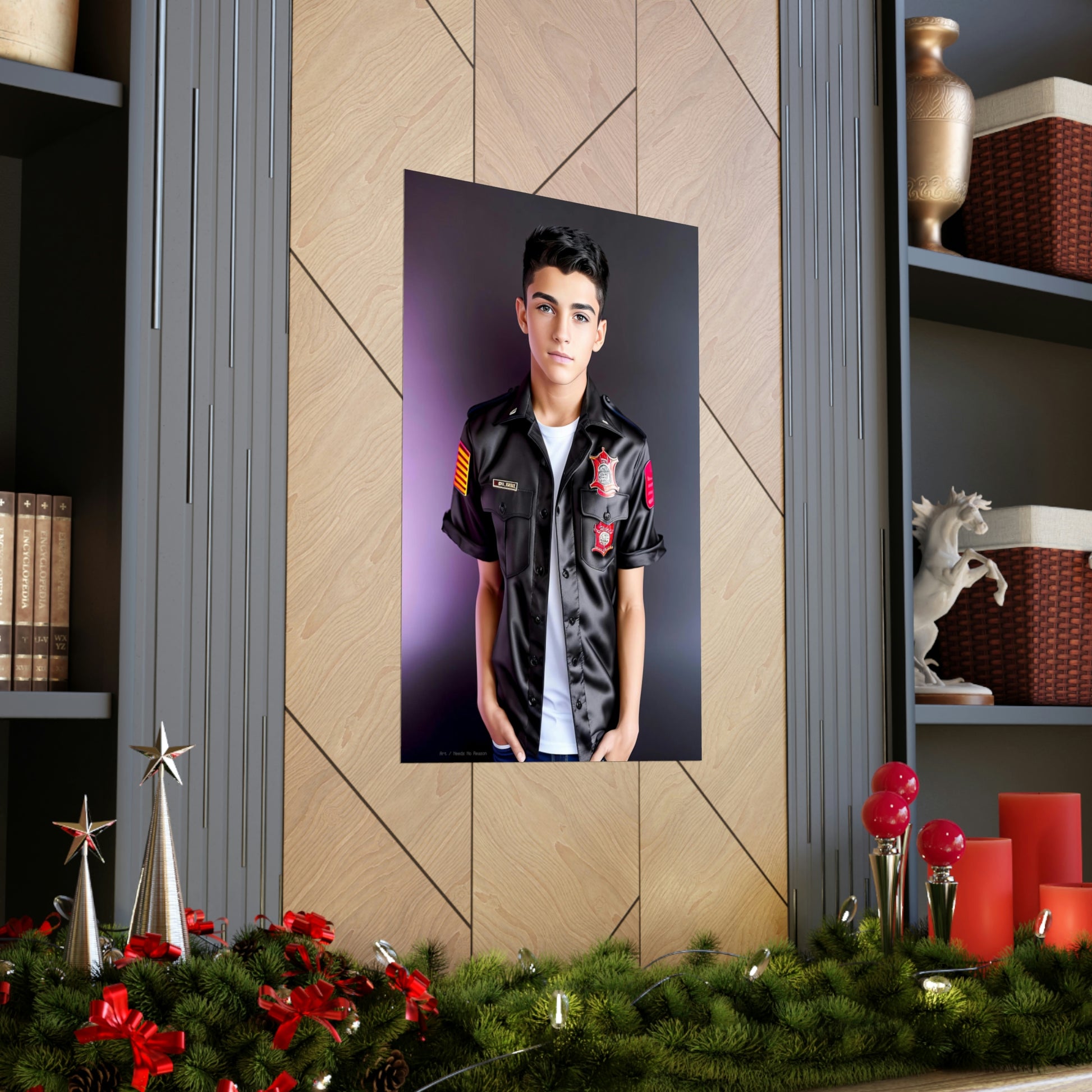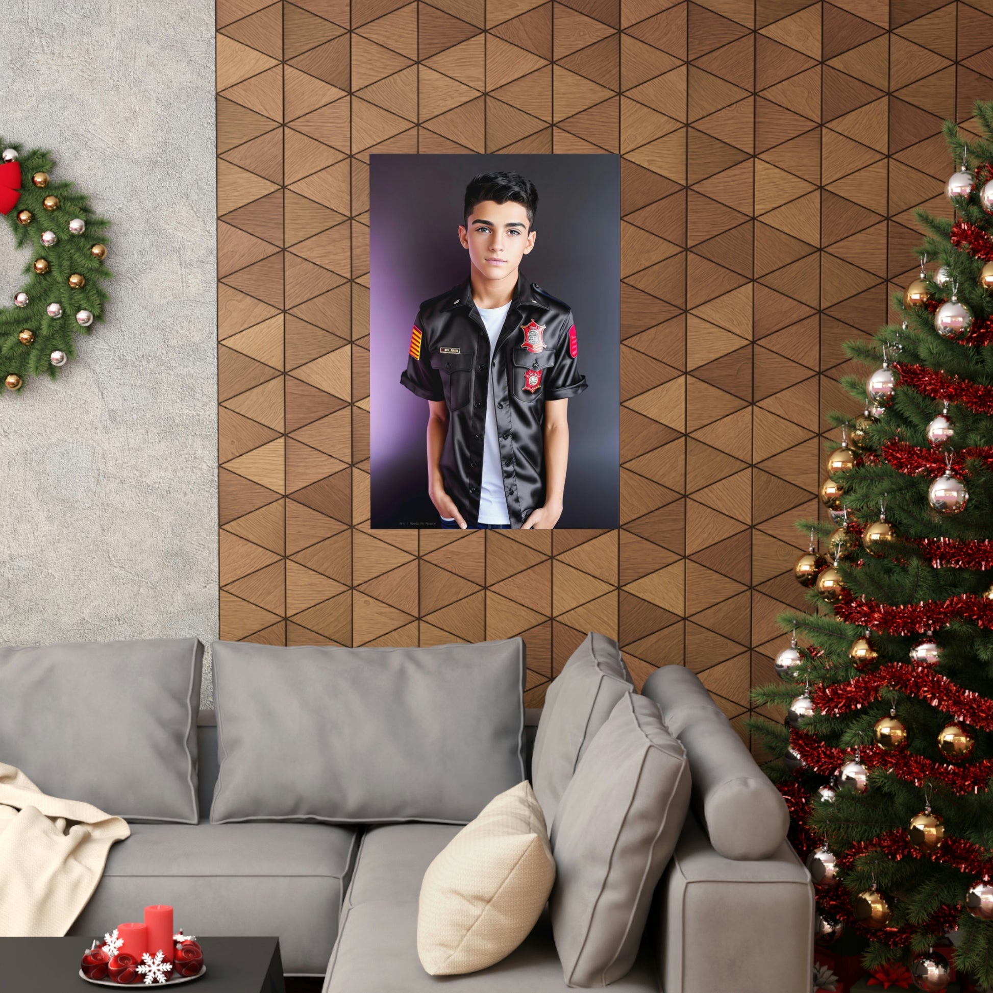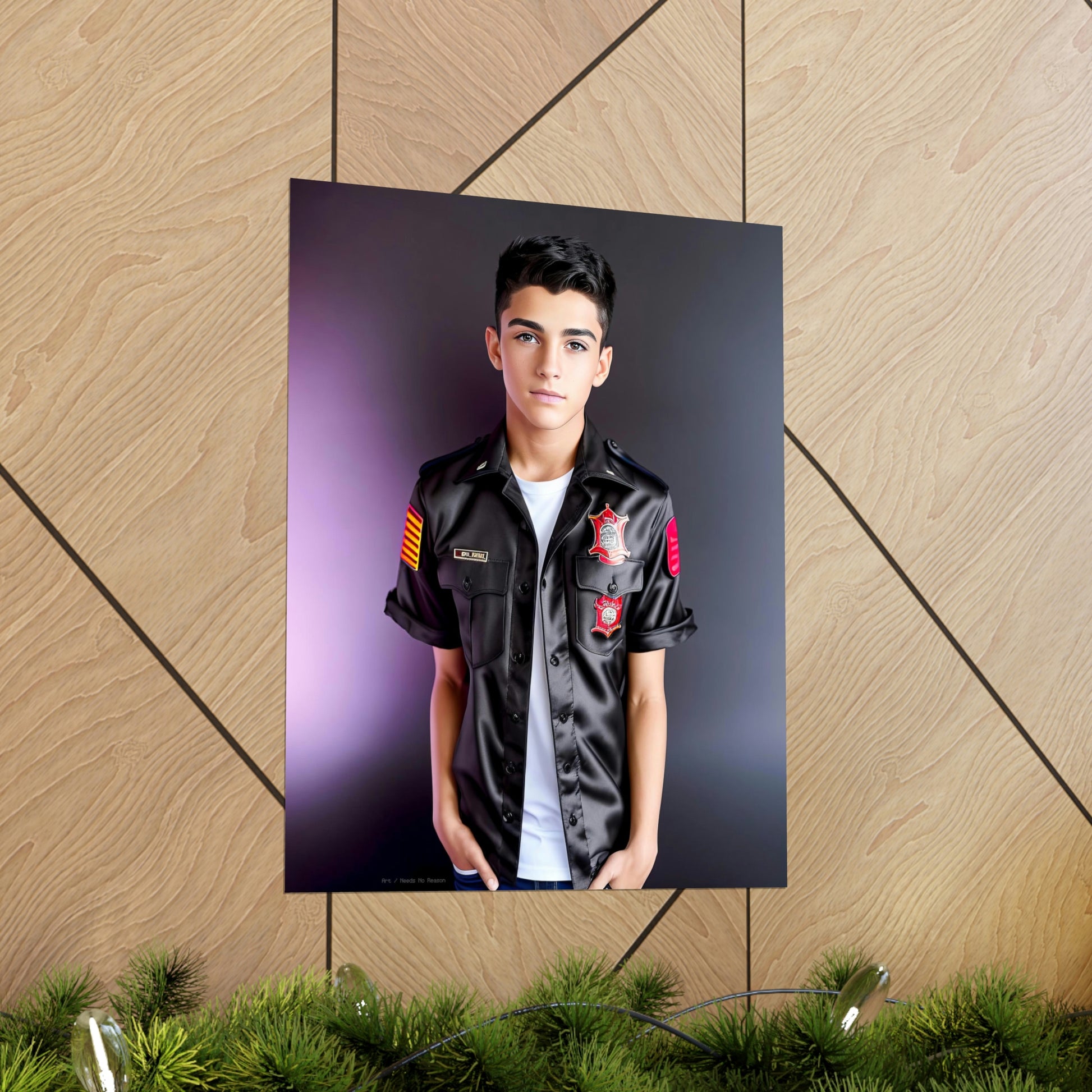 Premium matte inspirational vertical poster shows the boy proudly wearing a jacket with large shiny emblem of a firefighter’s squadron on the chest. The boy has a determined and committed expression on his face, which suggests that he has a clear idea of what he wants to become. Despite being skinny and young, he has the determination to become strong enough and will surely be ready when the time comes. He has his arms calmly placed in the pockets of his jeans, giving the impression of a relaxed and collected individual. The background is solid black with some violet light on the left side and some soft white light on the right, which creates a dramatic and contrasting effect.