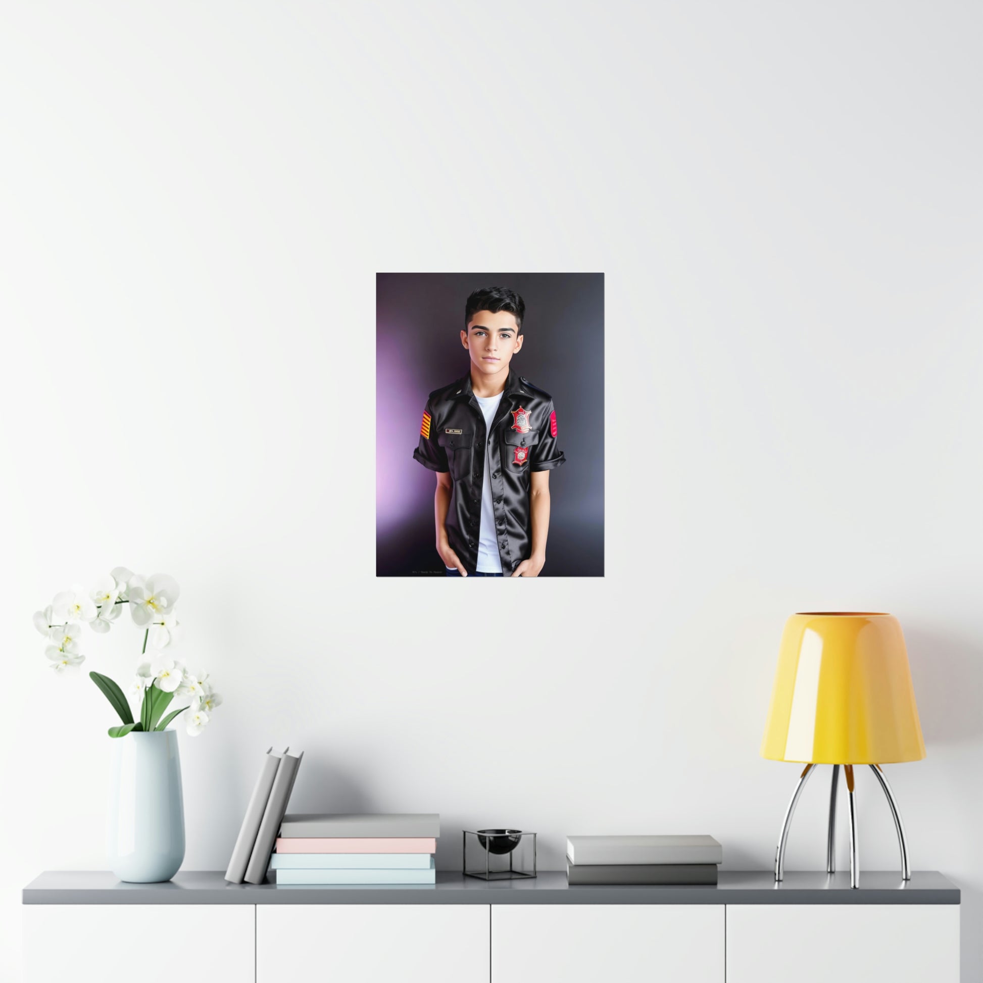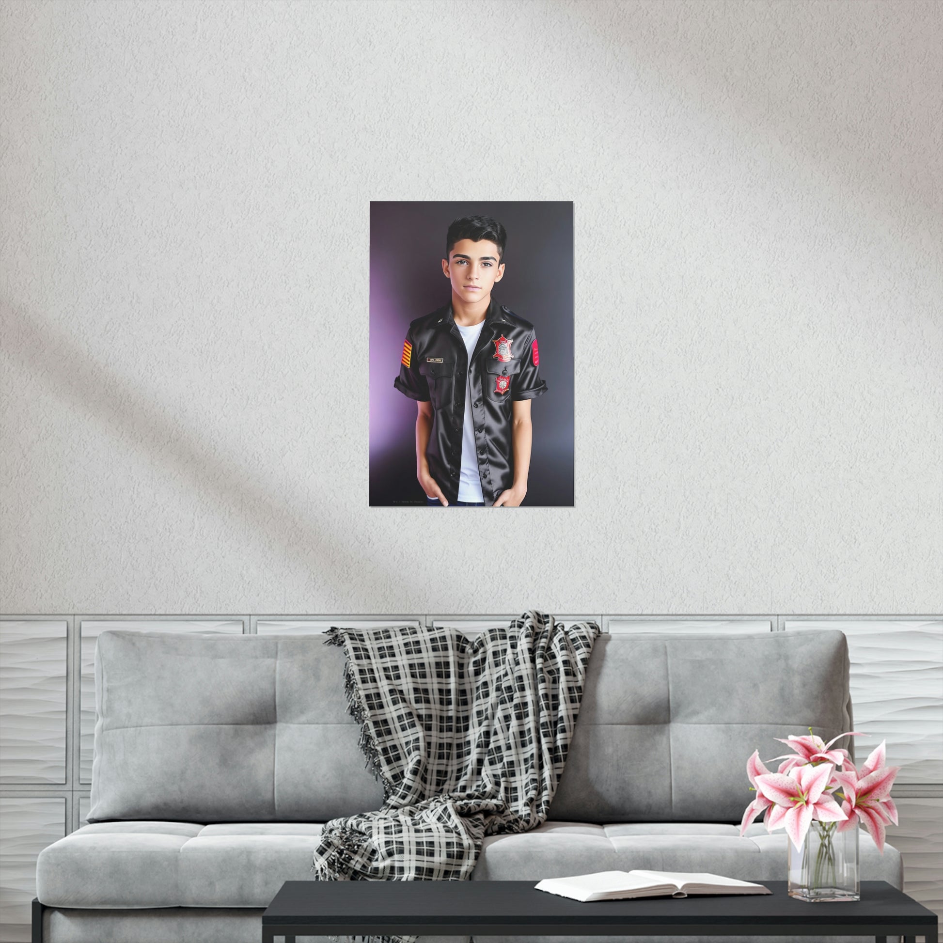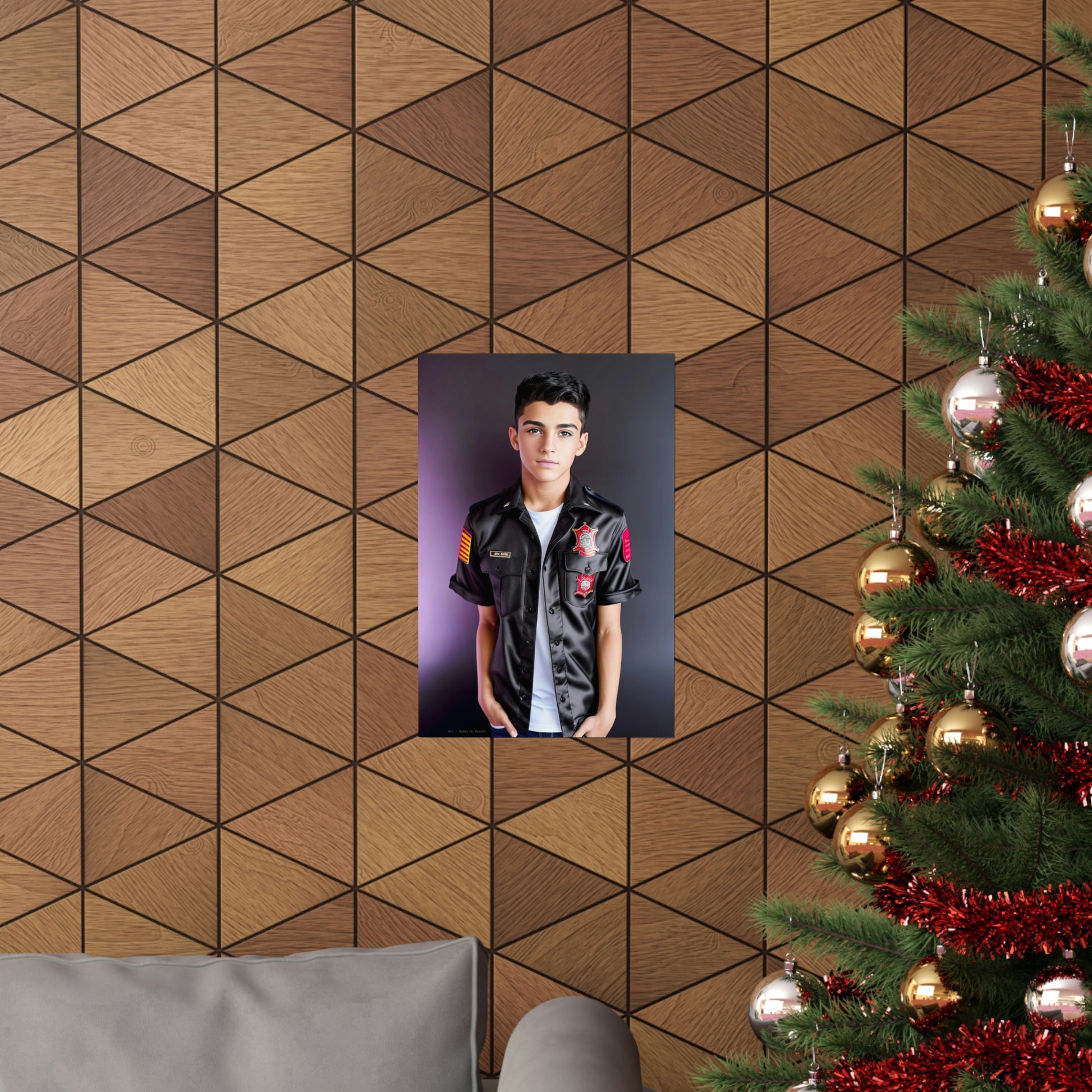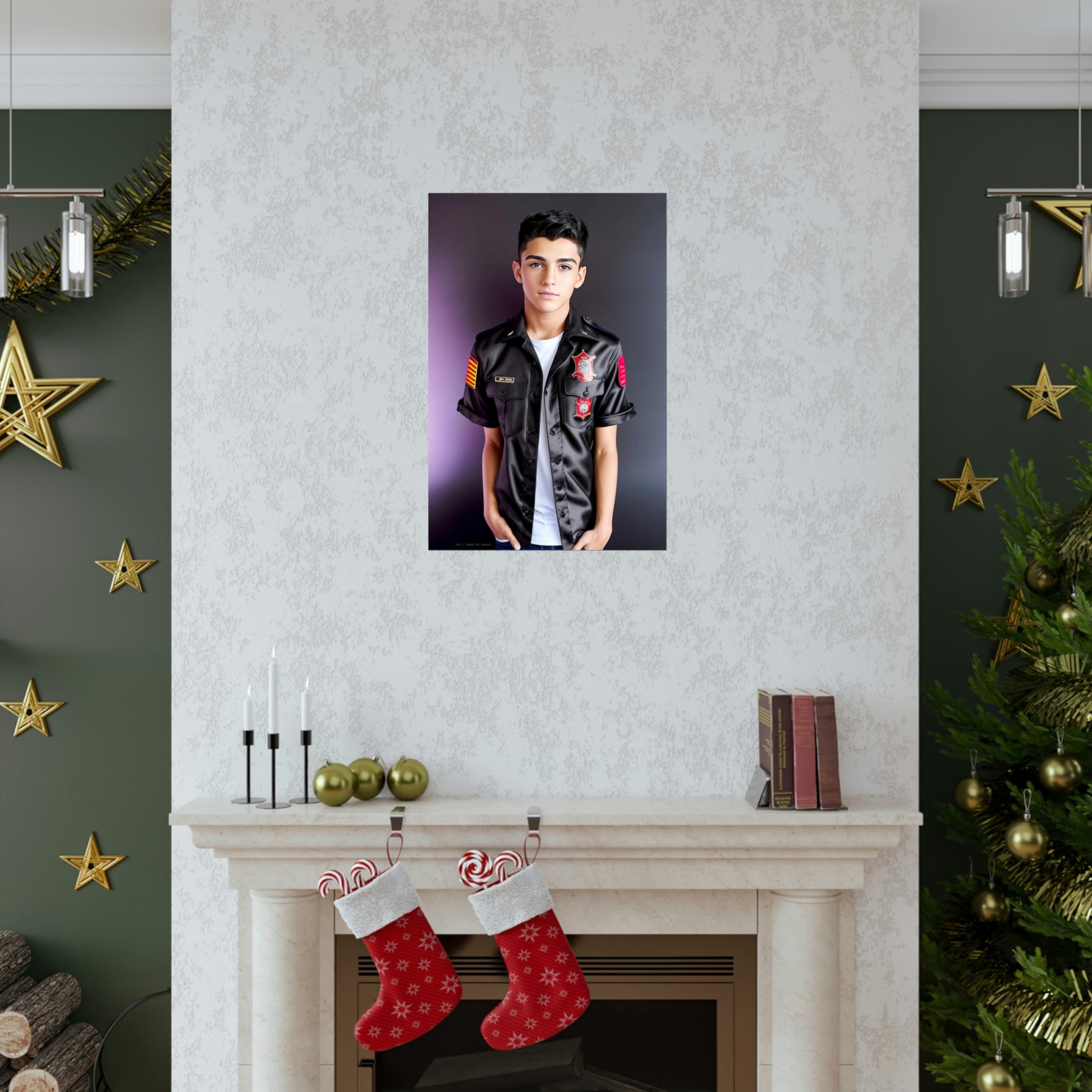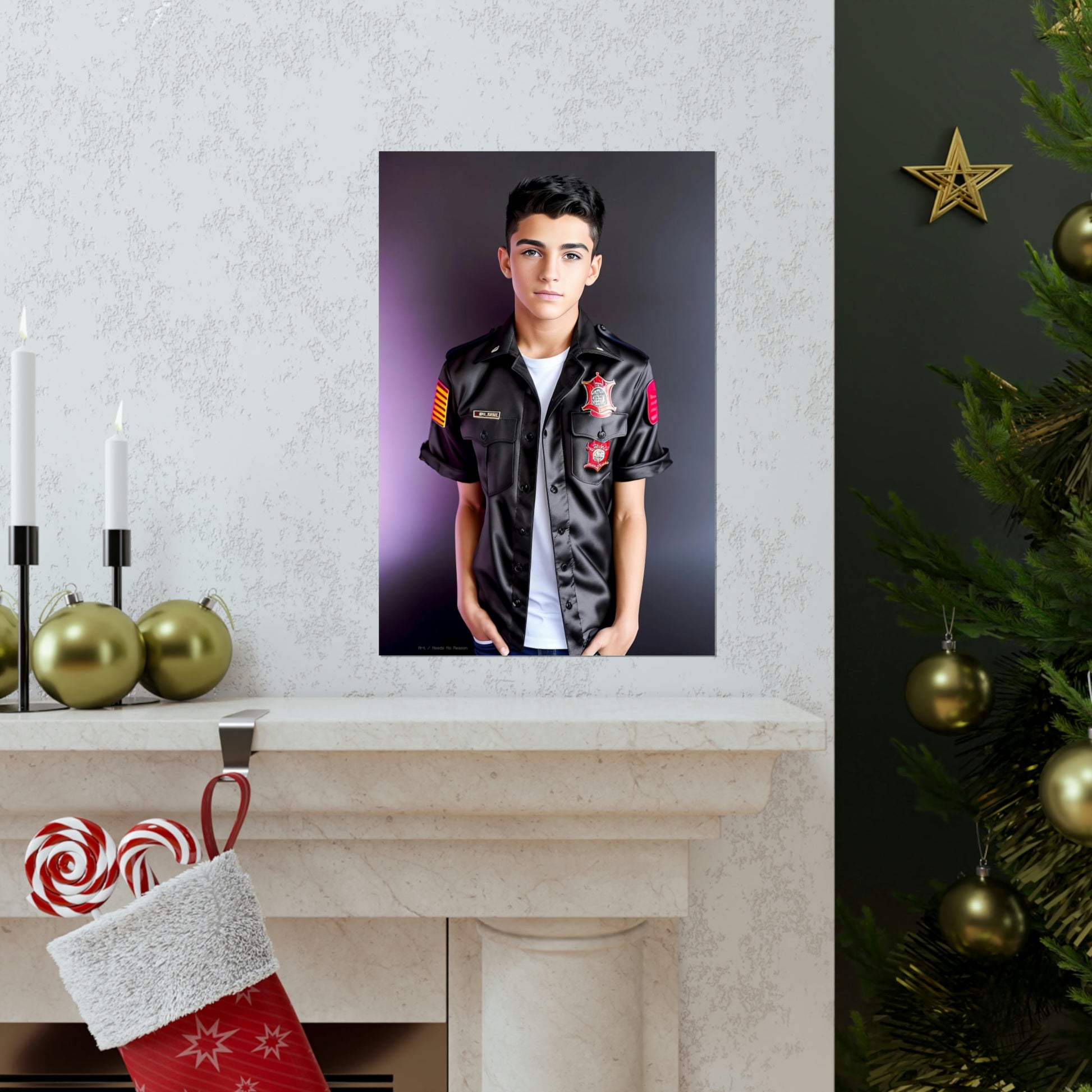 Premium matte inspirational vertical poster shows the boy proudly wearing a jacket with large shiny emblem of a firefighter’s squadron on the chest. The boy has a determined and committed expression on his face, which suggests that he has a clear idea of what he wants to become. Despite being skinny and young, he has the determination to become strong enough and will surely be ready when the time comes. He has his arms calmly placed in the pockets of his jeans, giving the impression of a relaxed and collected individual. The background is solid black with some violet light on the left side and some soft white light on the right, which creates a dramatic and contrasting effect.