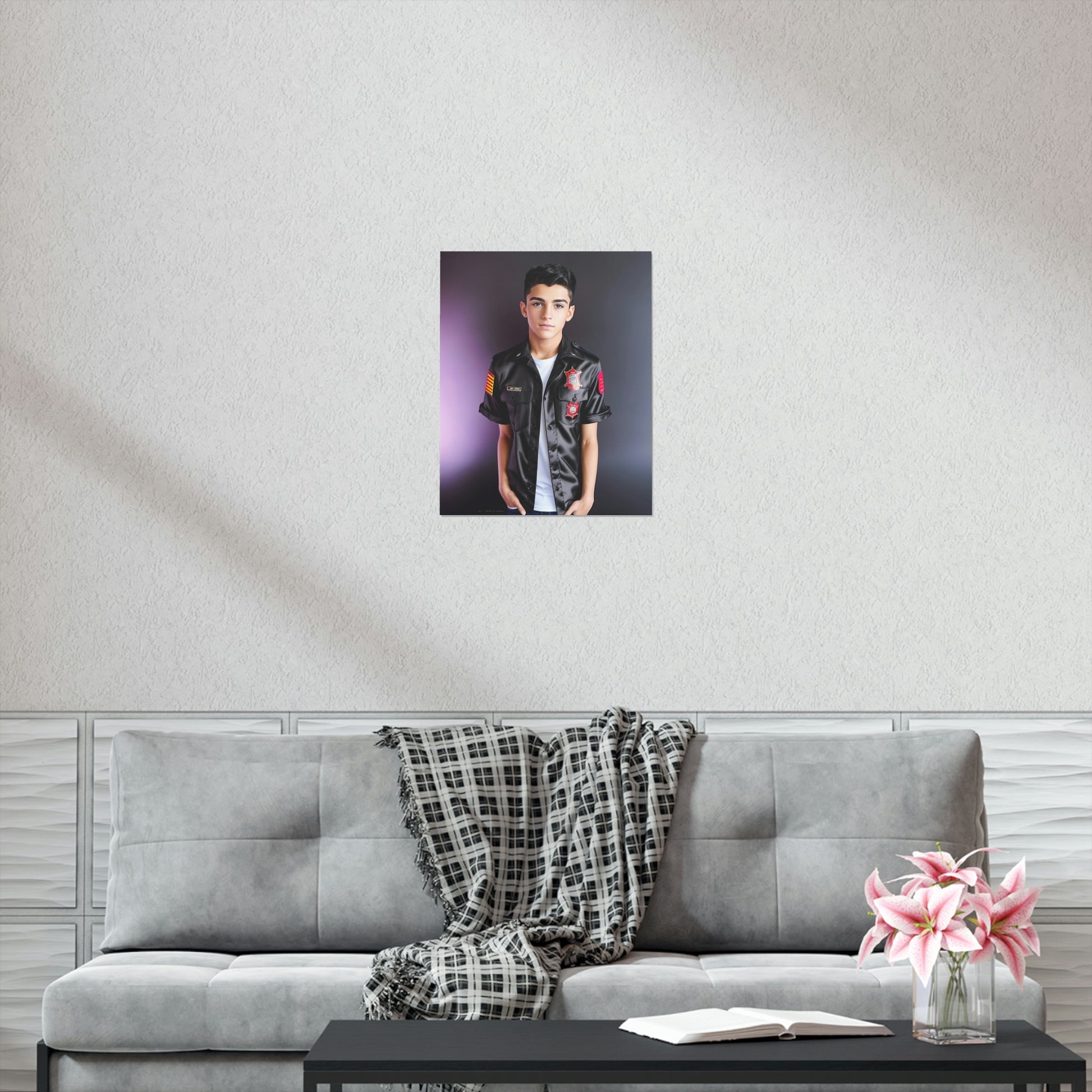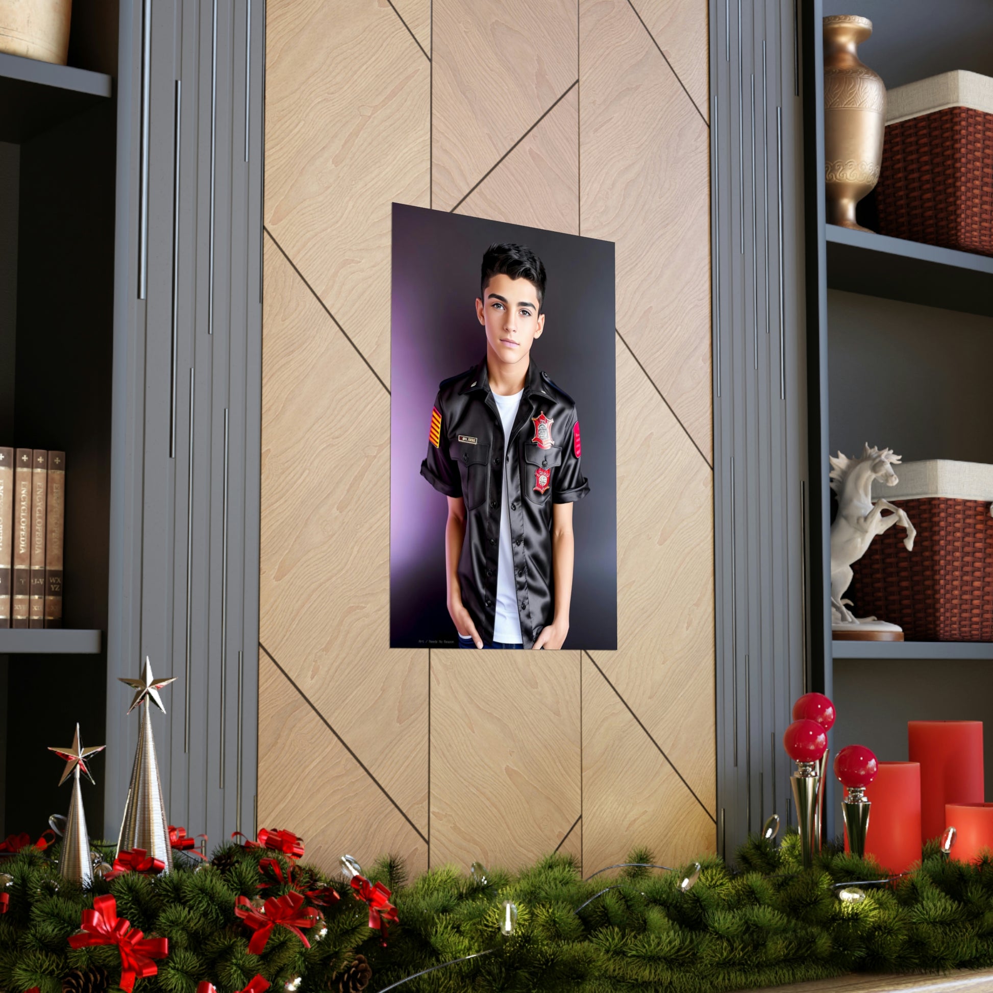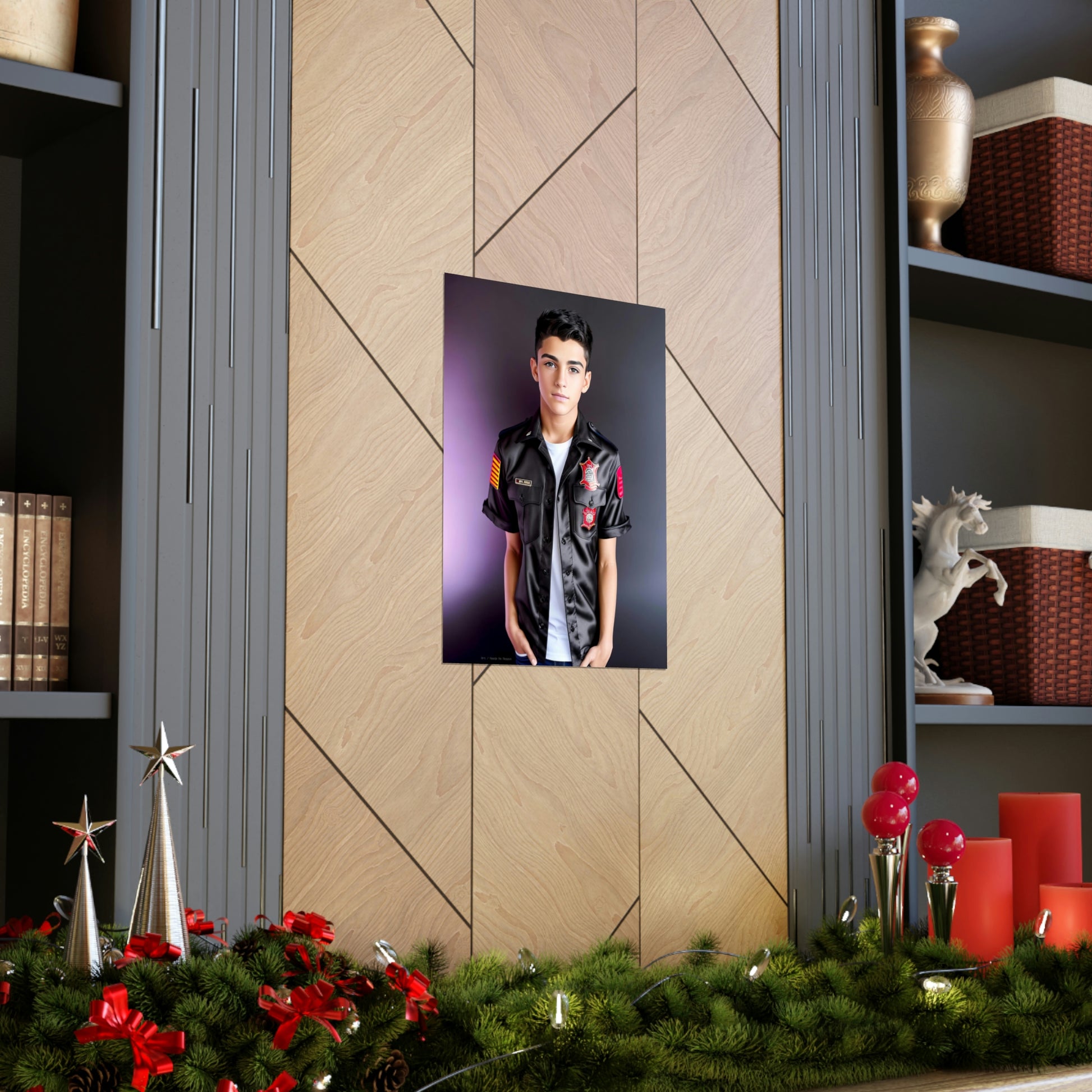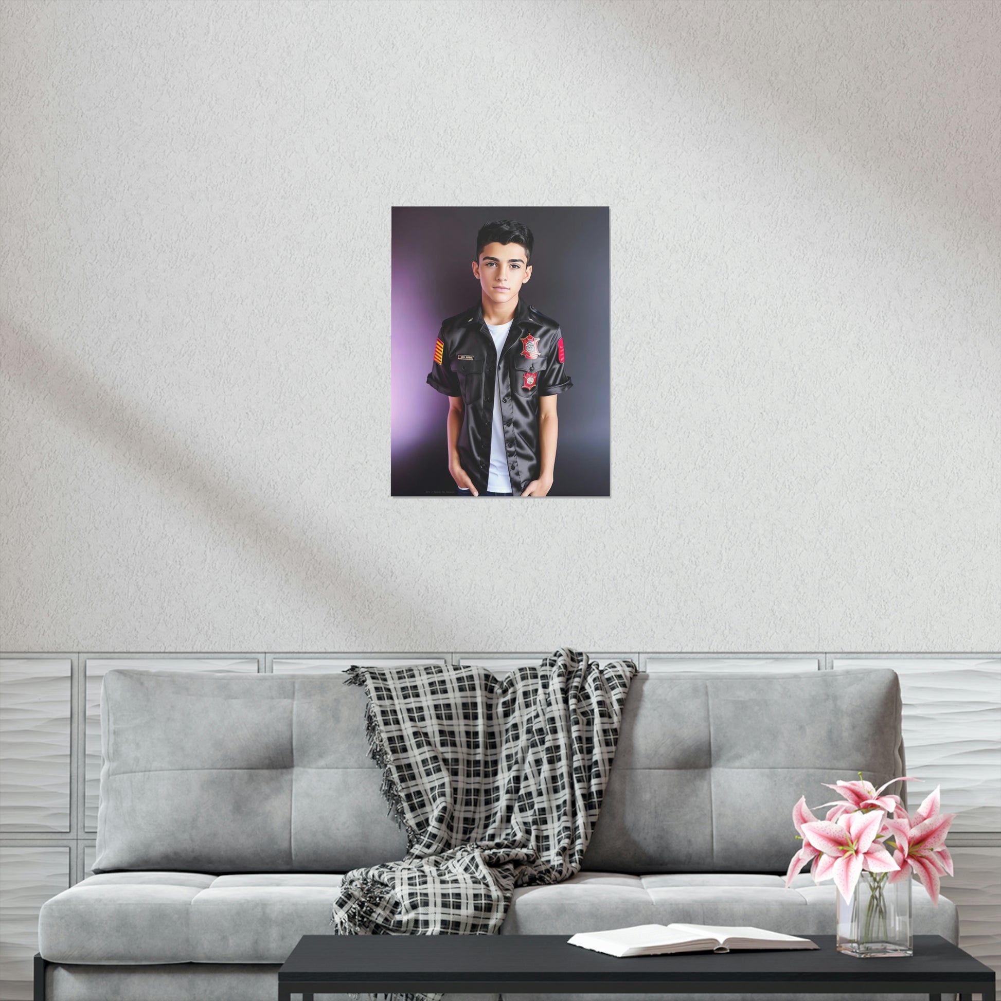 Premium matte inspirational vertical poster shows the boy proudly wearing a jacket with large shiny emblem of a firefighter’s squadron on the chest. The boy has a determined and committed expression on his face, which suggests that he has a clear idea of what he wants to become. Despite being skinny and young, he has the determination to become strong enough and will surely be ready when the time comes. He has his arms calmly placed in the pockets of his jeans, giving the impression of a relaxed and collected individual. The background is solid black with some violet light on the left side and some soft white light on the right, which creates a dramatic and contrasting effect.