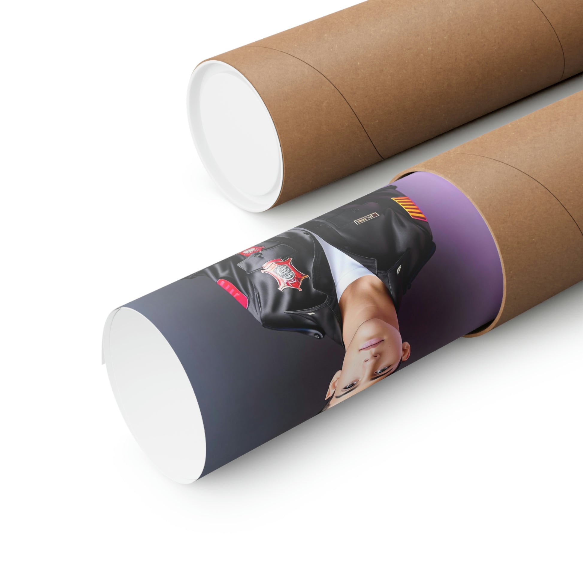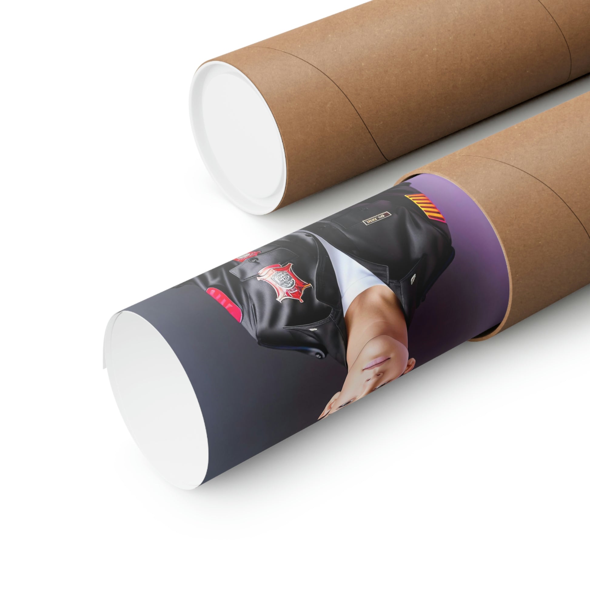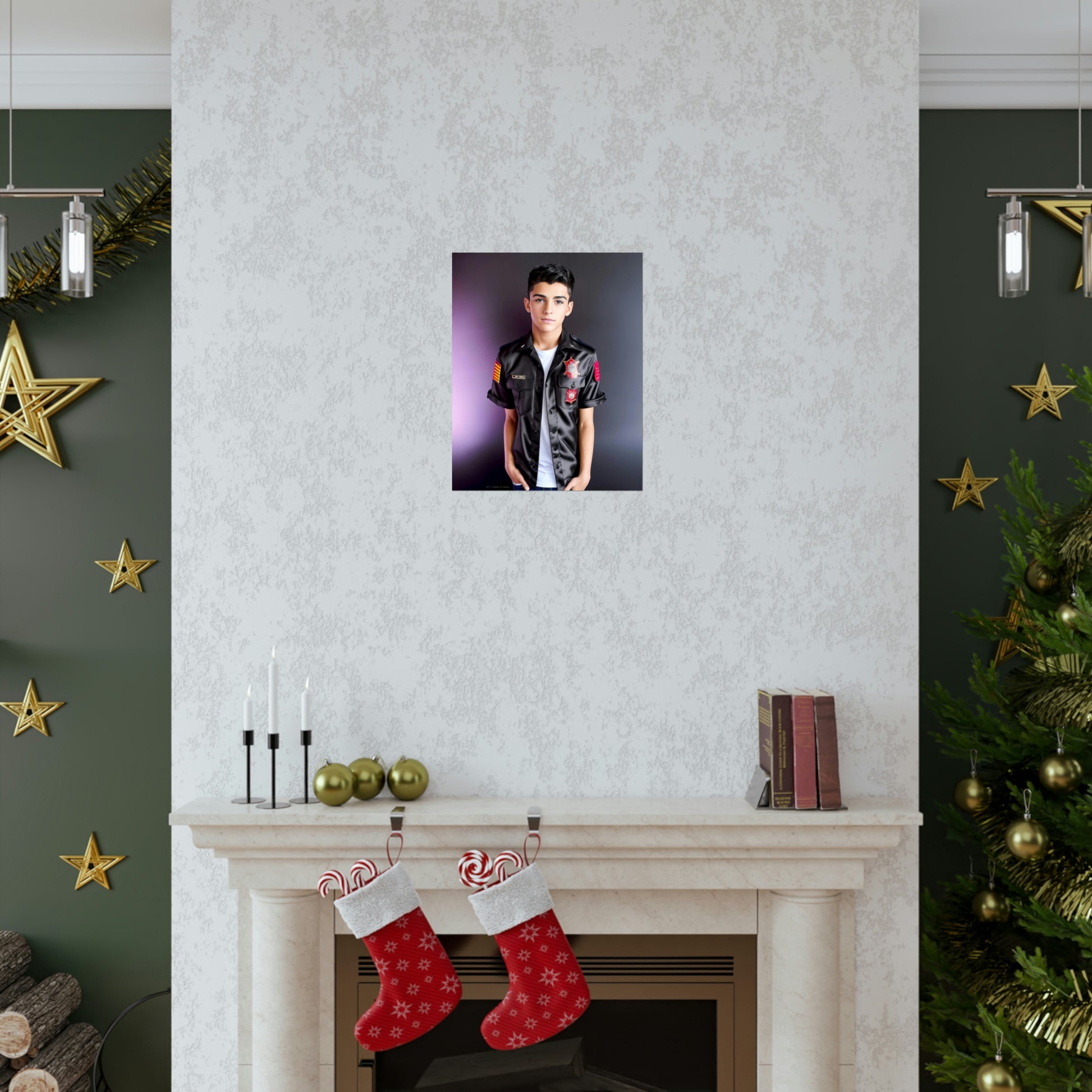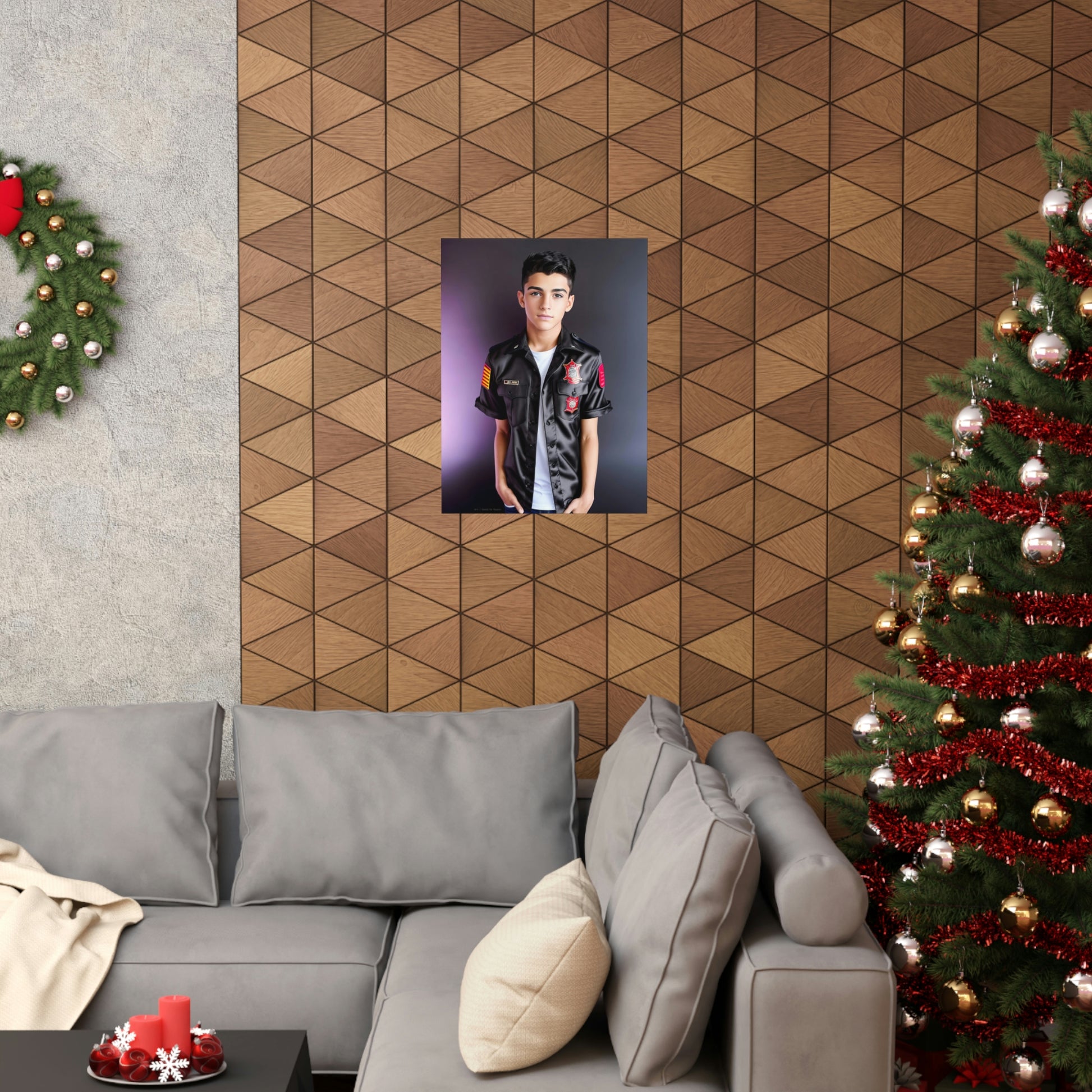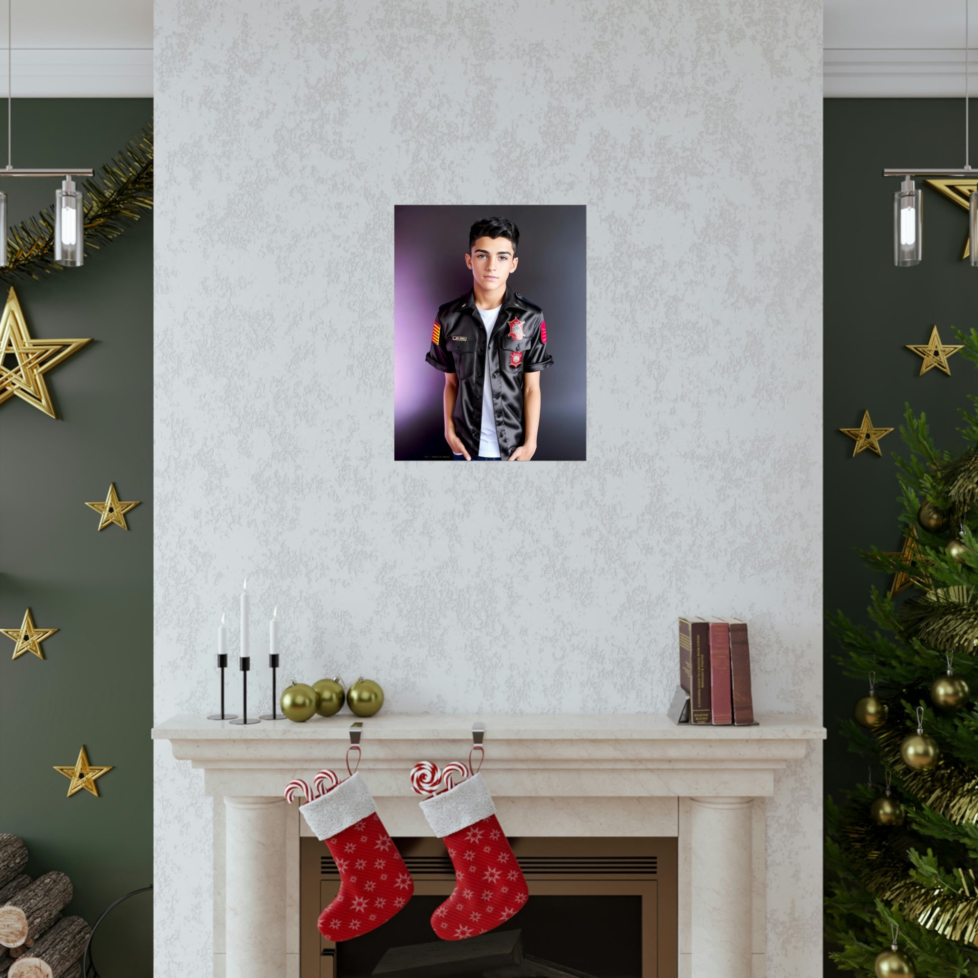 Premium matte inspirational vertical poster shows the boy proudly wearing a jacket with large shiny emblem of a firefighter’s squadron on the chest. The boy has a determined and committed expression on his face, which suggests that he has a clear idea of what he wants to become. Despite being skinny and young, he has the determination to become strong enough and will surely be ready when the time comes. He has his arms calmly placed in the pockets of his jeans, giving the impression of a relaxed and collected individual. The background is solid black with some violet light on the left side and some soft white light on the right, which creates a dramatic and contrasting effect.
